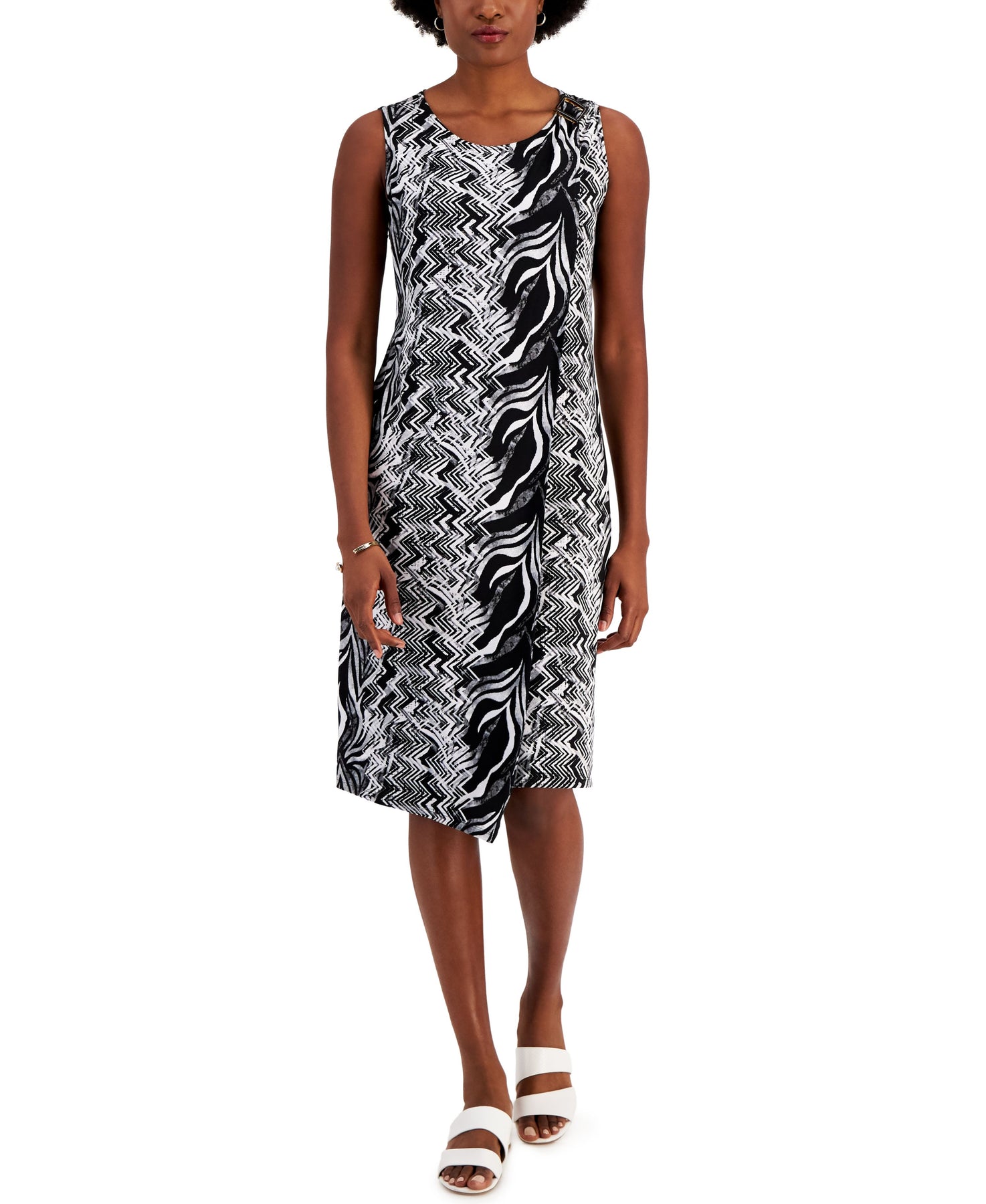 Update your closet with fresh prints in this abstract animal print dress from JM Collection. Keep it casual with sandals or add heels for a chic finish. Approx. model height is 5'10" and she is wearing a size medium Approx. 36-1/4" long from back of neck to hem, based on a size medium Fitted through the chest and waist; structured A-line skirt sits slightly over hips Due to generous sizing, we suggest sizing down for the perfect fit Round neckline; A-line silhouette Pullover styling Buckle detail at shoulder Unlined Polyester/spandex Machine washable Imported Web ID: 13807778