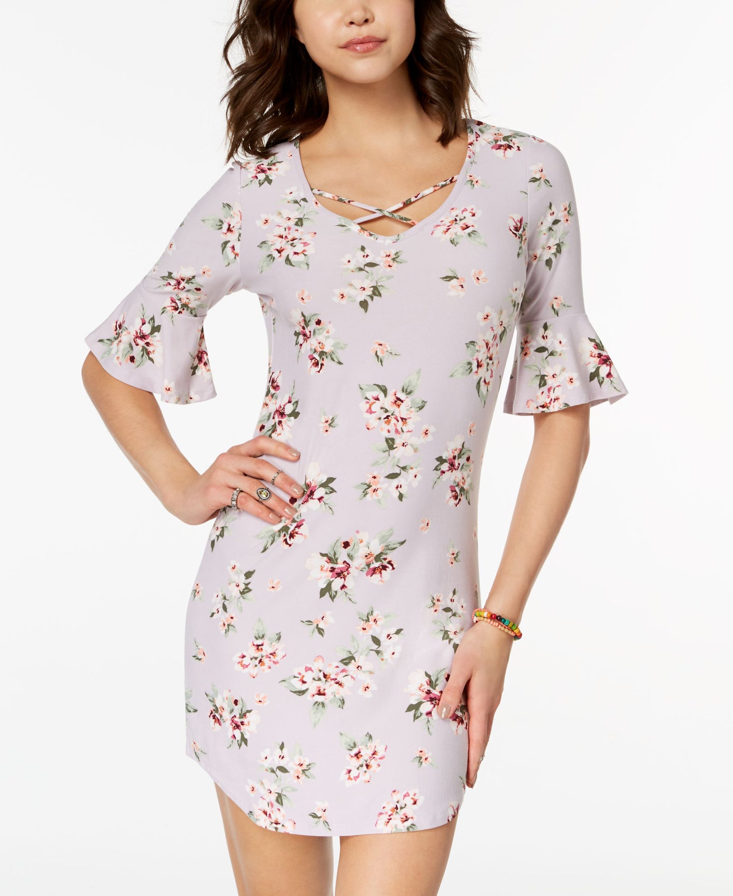 Crisscross neckline details and flirty ruffled sleeves add fashion flair to Ultra Flirt's floral-printed bodycon dress. Pullover style Short length Scoop neckline; bodycon silhouette Ruffled 3/4-sleeves Front crisscross strap detail Rounded hem Unlined Polyester/spandex Machine washable Imported Web ID: 5740197