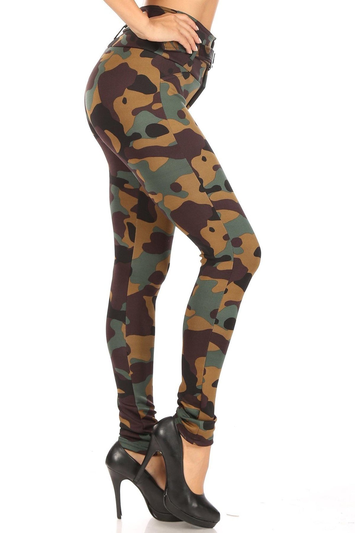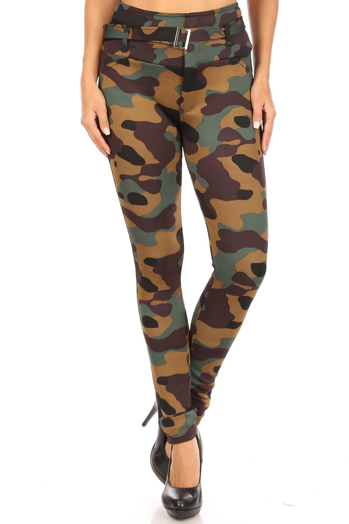 Any season is the perfect time to break out these comfortable and trendy Brown Camouflage High Waist Belted Treggings. These stretchy high waist bottoms offer a figure flattering look, built in belt, and a fashionable army print design.