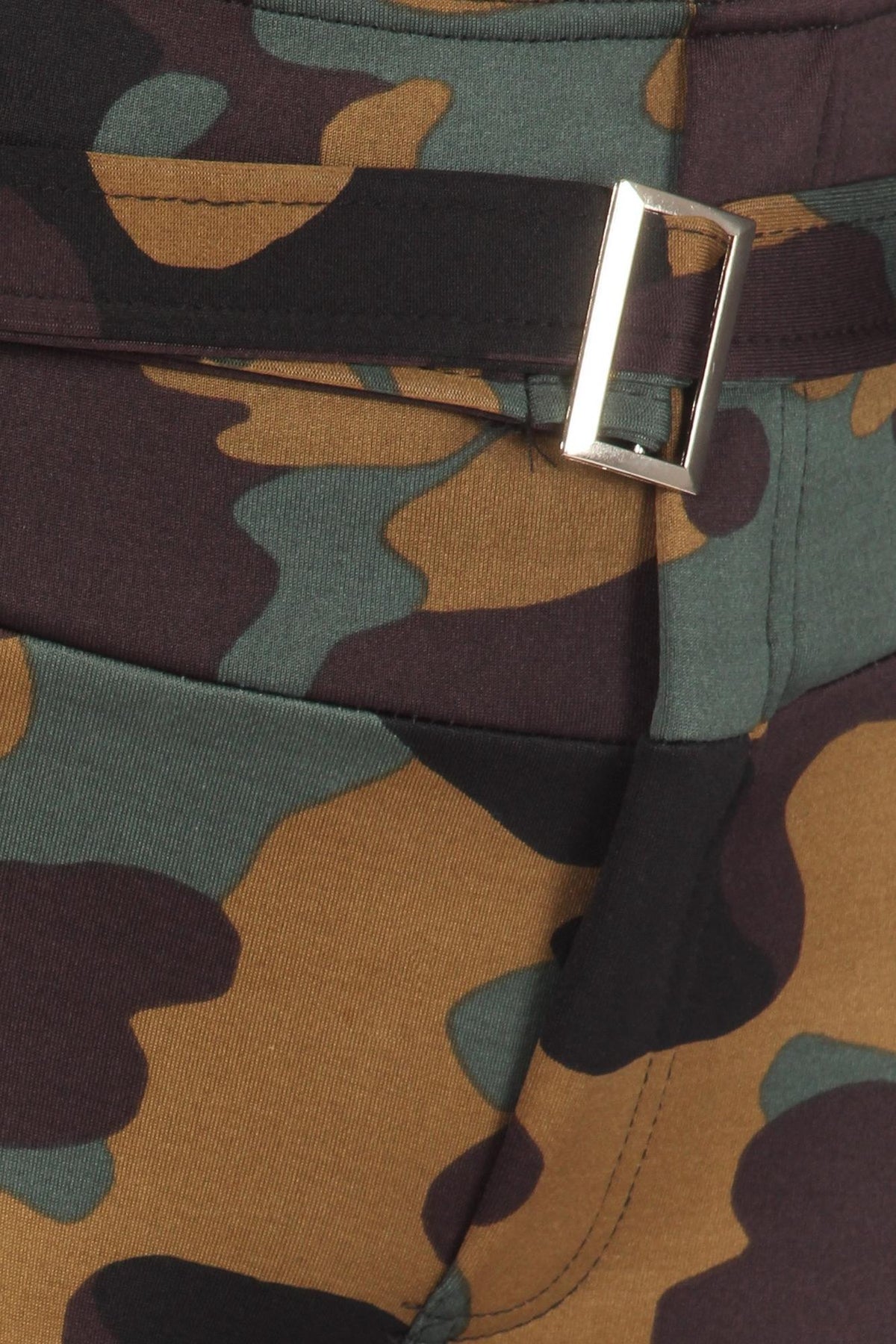 • Features Belt Detail with Silver Buckle and a Stylish Camo Design for Any Season