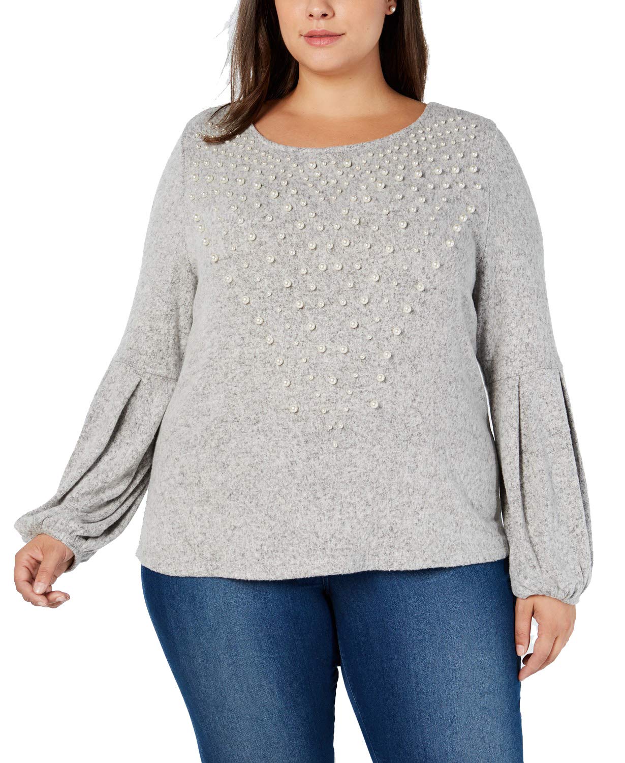 I.N.C. Plus Size Pearl-Embellished Puff-Sleeve Sweater