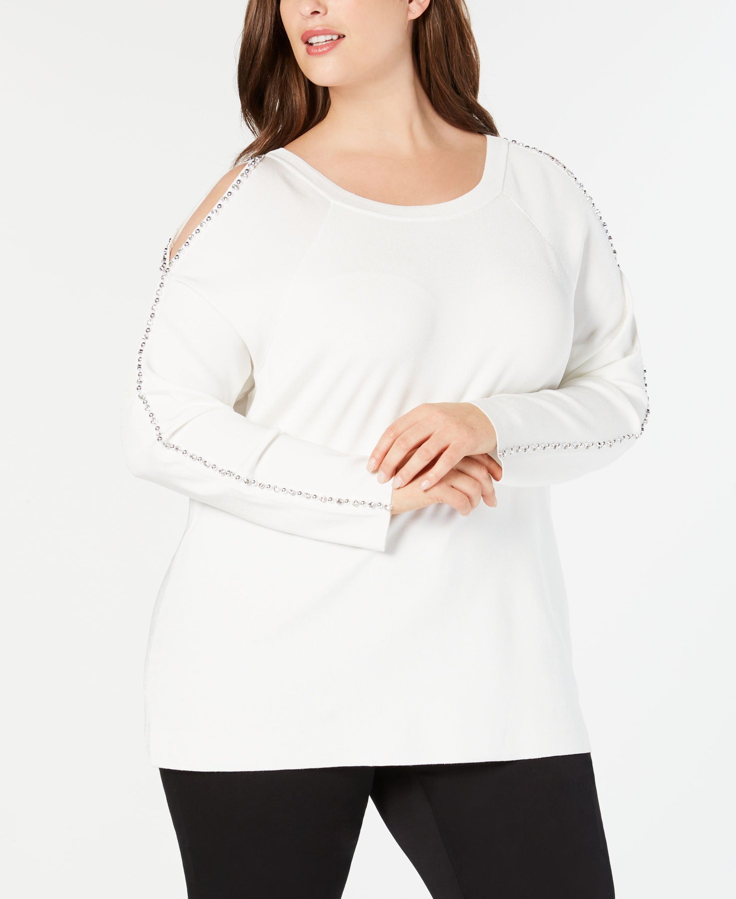 I.N.C. Plus Size Rhinestone-Trim Cold-Shoulder Sweater