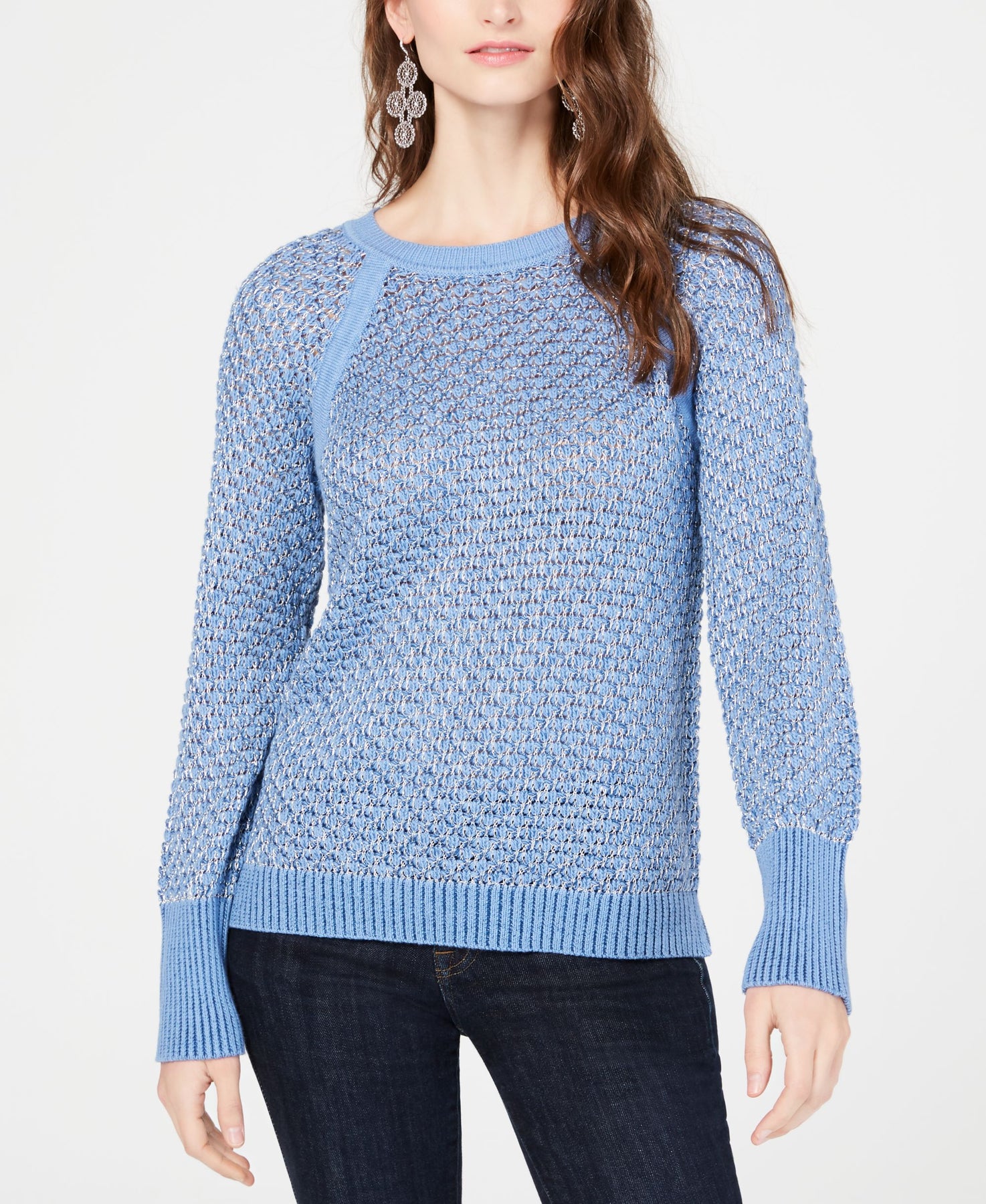 Casual, comfy and with subtle seen. Pull on this I.N.C. International Concepts lurex sweater and pair it with your favorite jeans for the ultimate cozy-cute ensemble. Approx. model height is 5'10" and she is wearing a size small Fitted; hits at hip Scoop neckline Cotton/rayon/viscose/metallic threading/nylon Machine washable Imported