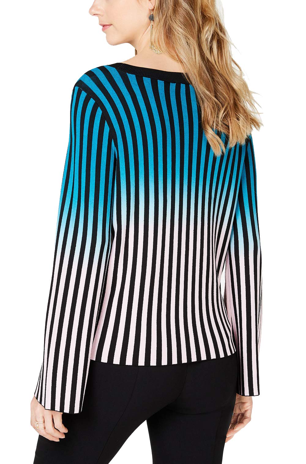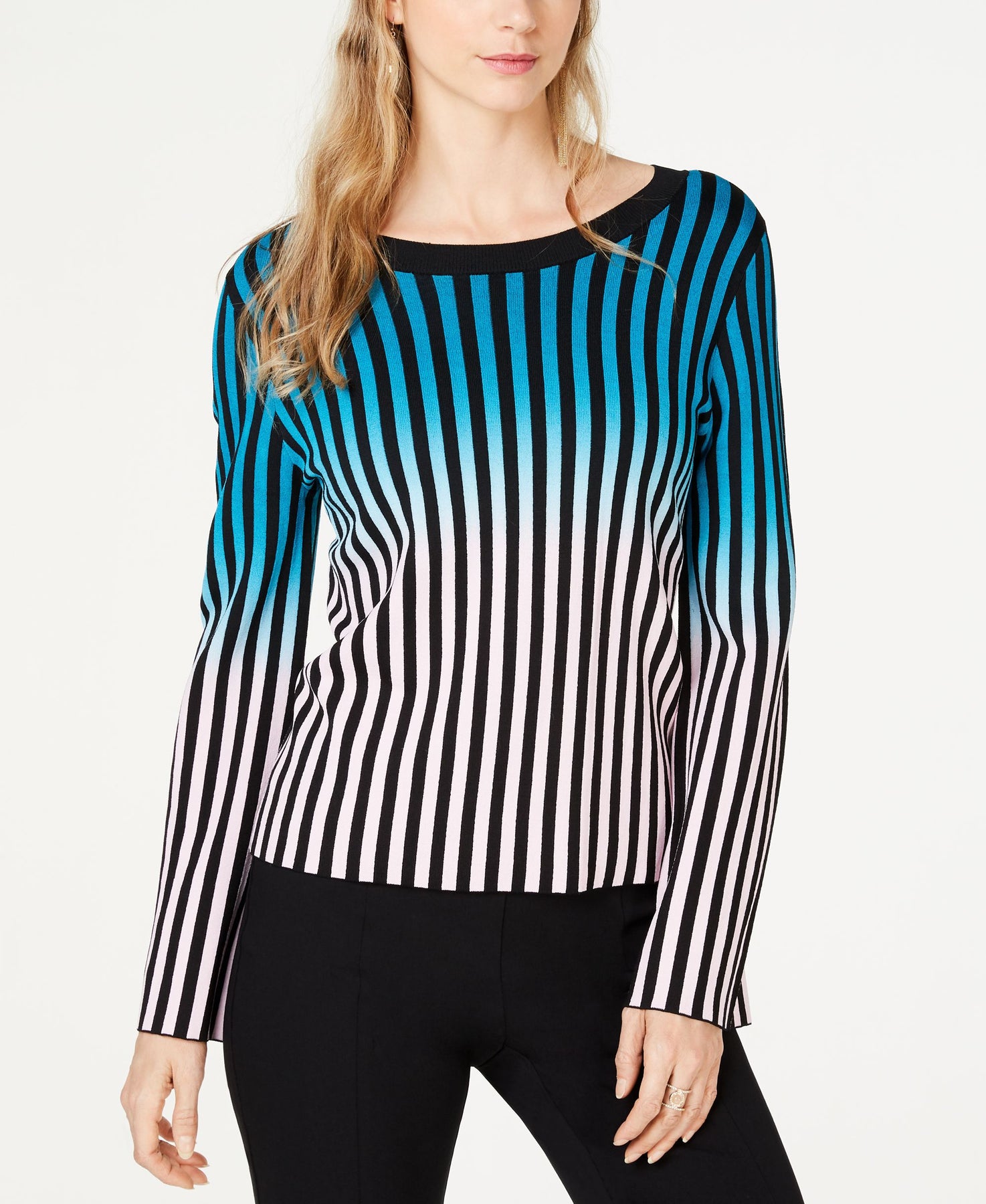 Ombre shades and contrast stripes create an eye-catching effect on this statement sweater from I.N.C. International Concepts. Approx. model height is 5'10" and she is wearing a size small Hits at hip; fitted Crewneck Viscose/nylon Machine washable Imported