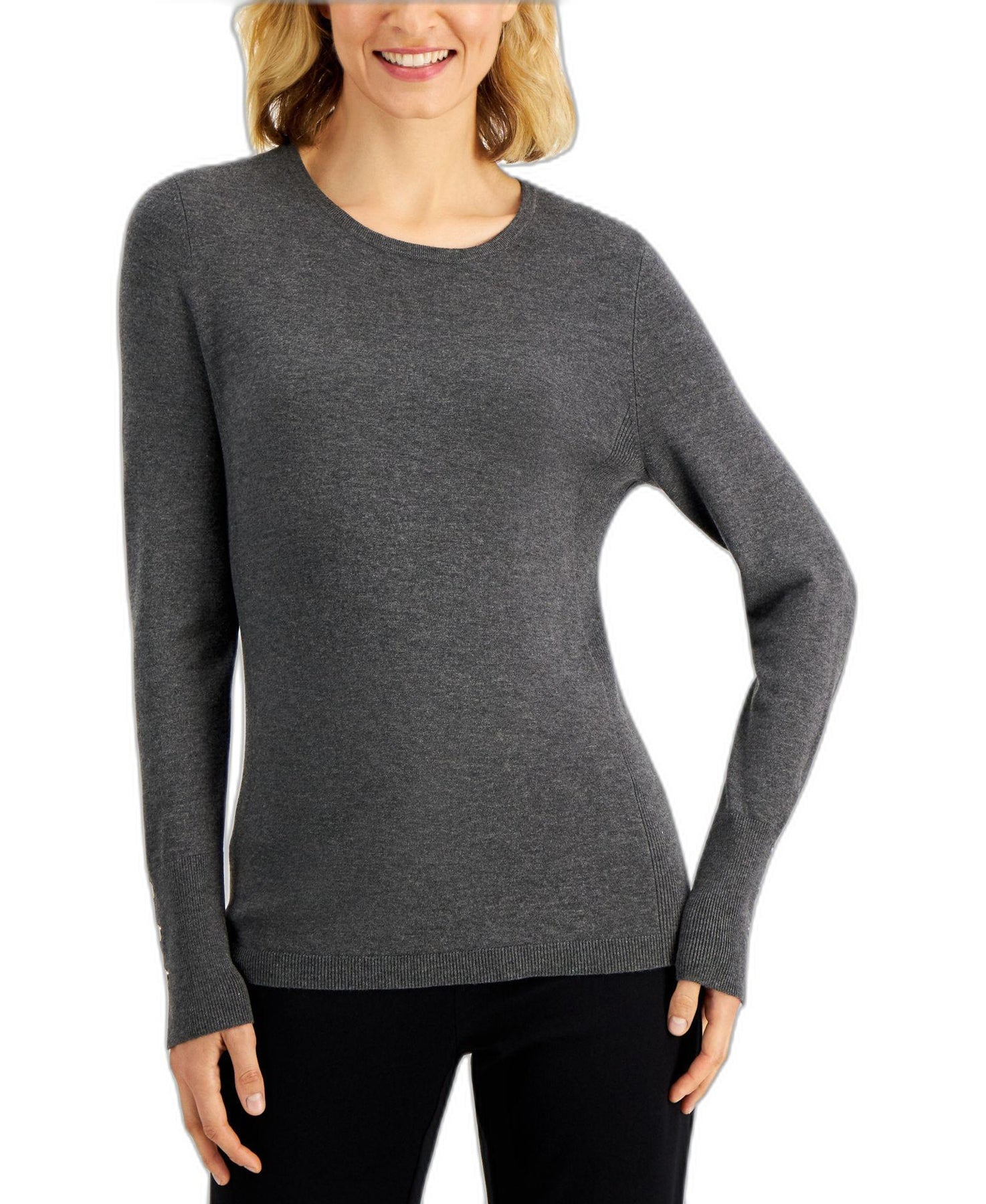 Dazzling rivet details at the cuffs make this petite sweater from JM Collection a knock-out addition to your wardrobe. Approx. 23" long Designed to fit and flatter 5'4" and under frame Crewneck Rivet details at cuffs Rayon/nylon Machine washable Imported Web ID: 17906070