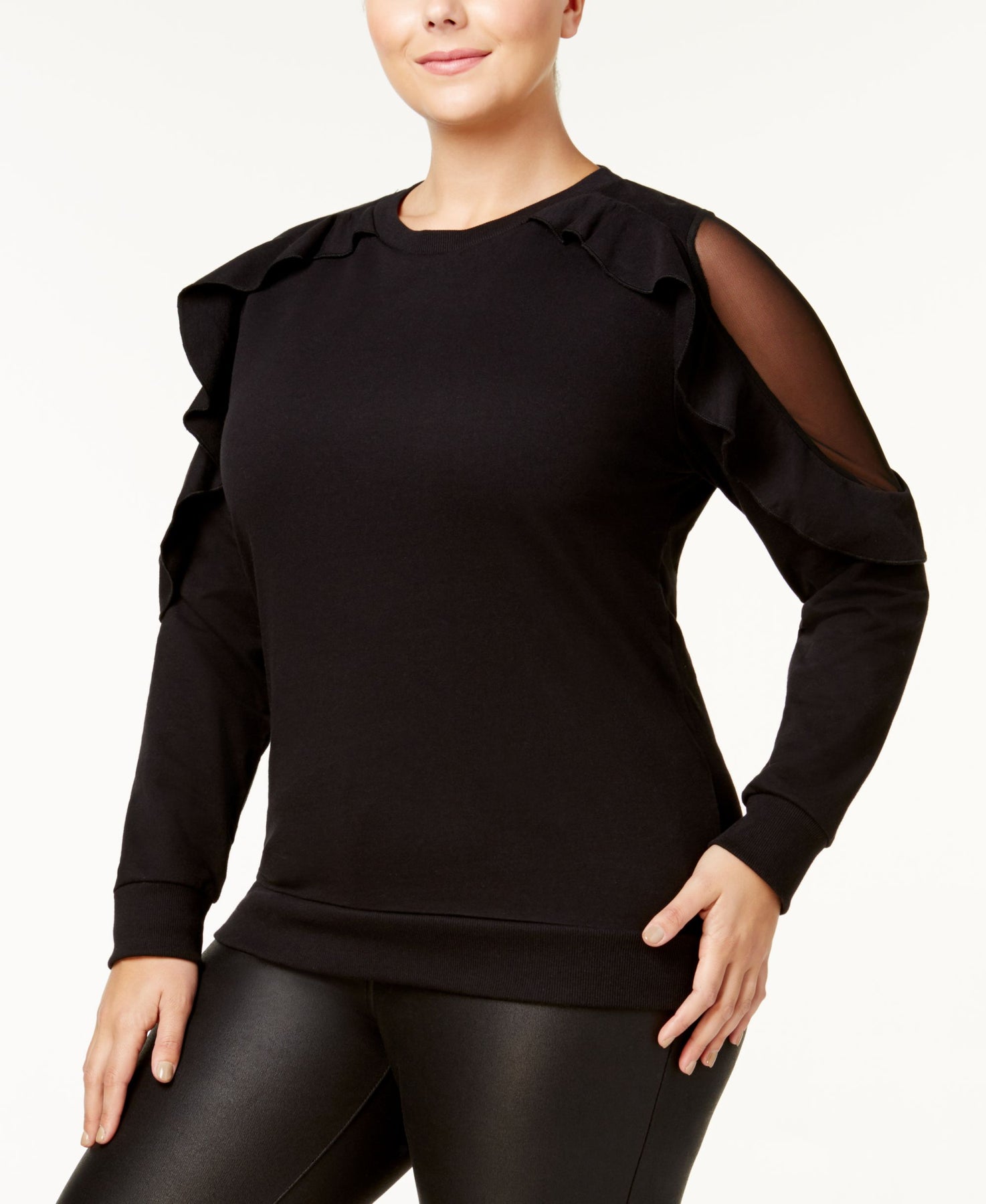 Say What? ups the chic factor of your casual collection with this plus size sweater, designed with flirty mesh insets at each sleeve surrounded by ruffled trim for added coverage. Scoop neckline Approx. model measurements: height: 5'10"; bust: 38", waist: 34"; hips: 45" Mesh insets with ruffled trim at sleeves Hits at hip Cotton/polyester Machine washable Imported