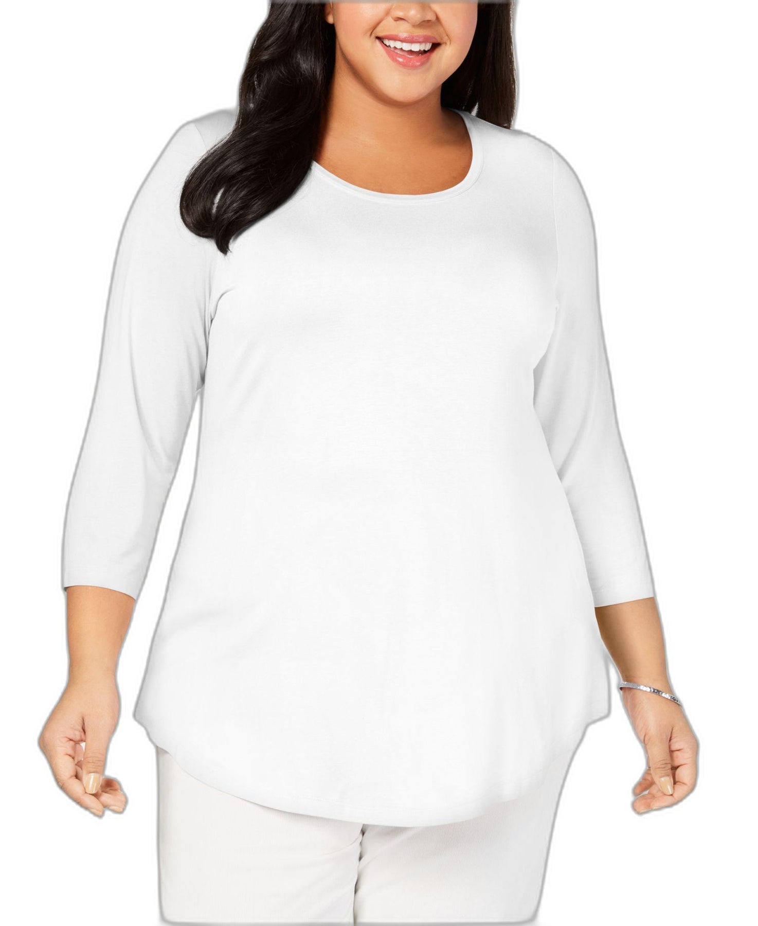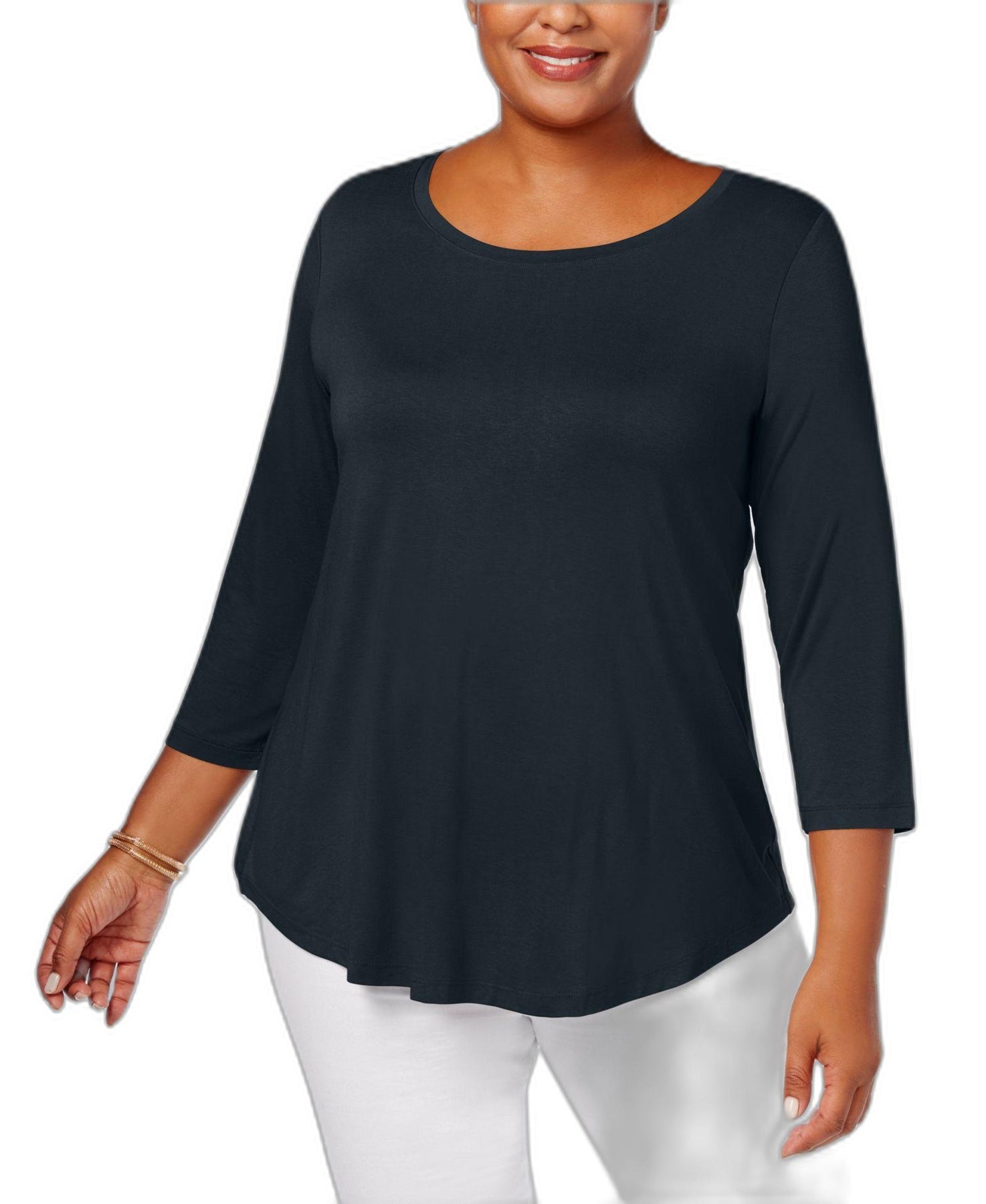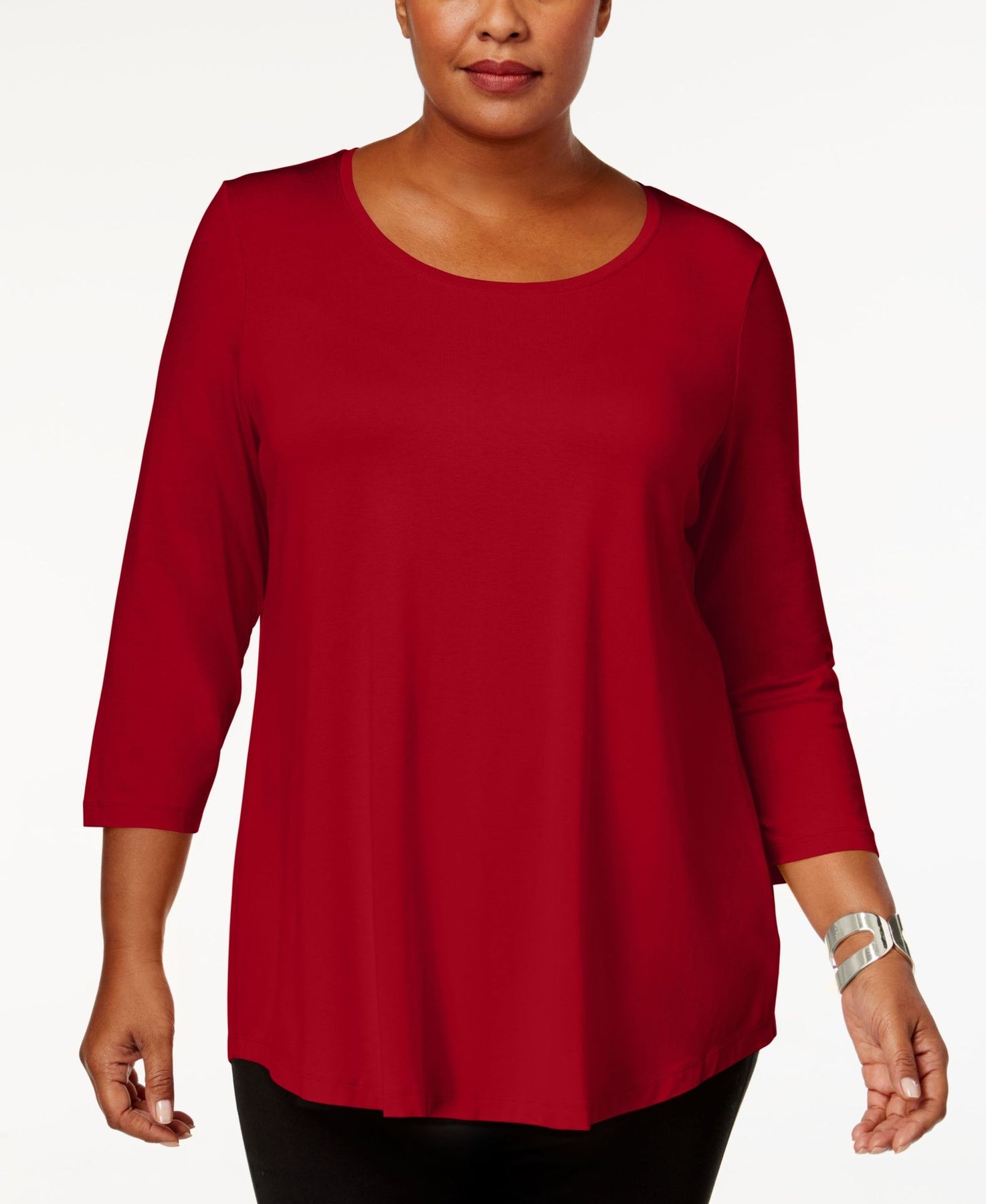 Featuring classic comfort and sleek style, this plus size top from JM Collection is a versatile wardrobe essential. Approx. length: 29" Scoop neckline Pullover styling 3/4-length sleeves Rounded hem Same Great Fit. Same Great Brand. New, Fresh Label. Rayon/spandex Machine washable Imported Web ID: 15919788