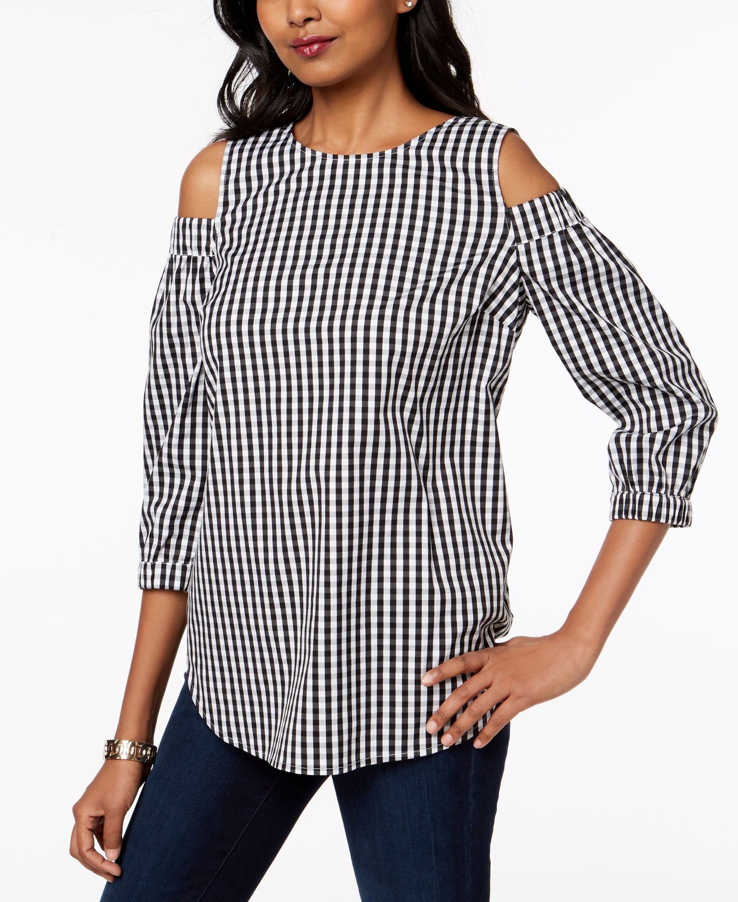 Woven gingham-print fabric provides a cheery background for this cold-shoulder tunic. Charter Club's top is finished with an elongated shirttail hem. Approx. model measurements: height: 5'10"; bust: 35-1/2"; waist: 27"; hips: 35"; model is wearing a size Medium Relaxed fit; hits at thigh Due to generous sizing, we suggest sizing down for the perfect fit Crew neckline; button at back keyhole Cutout shoulders; shirttail hem 3/4-length blouson sleeves; gathered cuffs Cotton/nylon/spandex Machine washable Imported