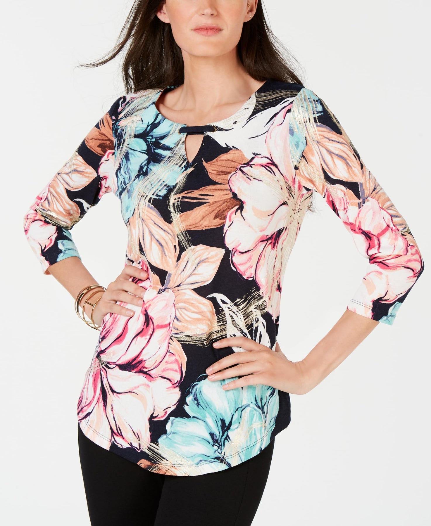 Fitted and fabulous, a bright floral print and cute keyhole detail make this top from JM Collection an essential for everyday style. Approx. model height is 5'10" and she is wearing a size small Hits at hip Due to generous sizing, we suggest sizing down for the perfect fit Scoop neckline with keyhole and grommet detail 3/4-sleeves Shell: polyester/spandex; trim: metal Machine washable Imported