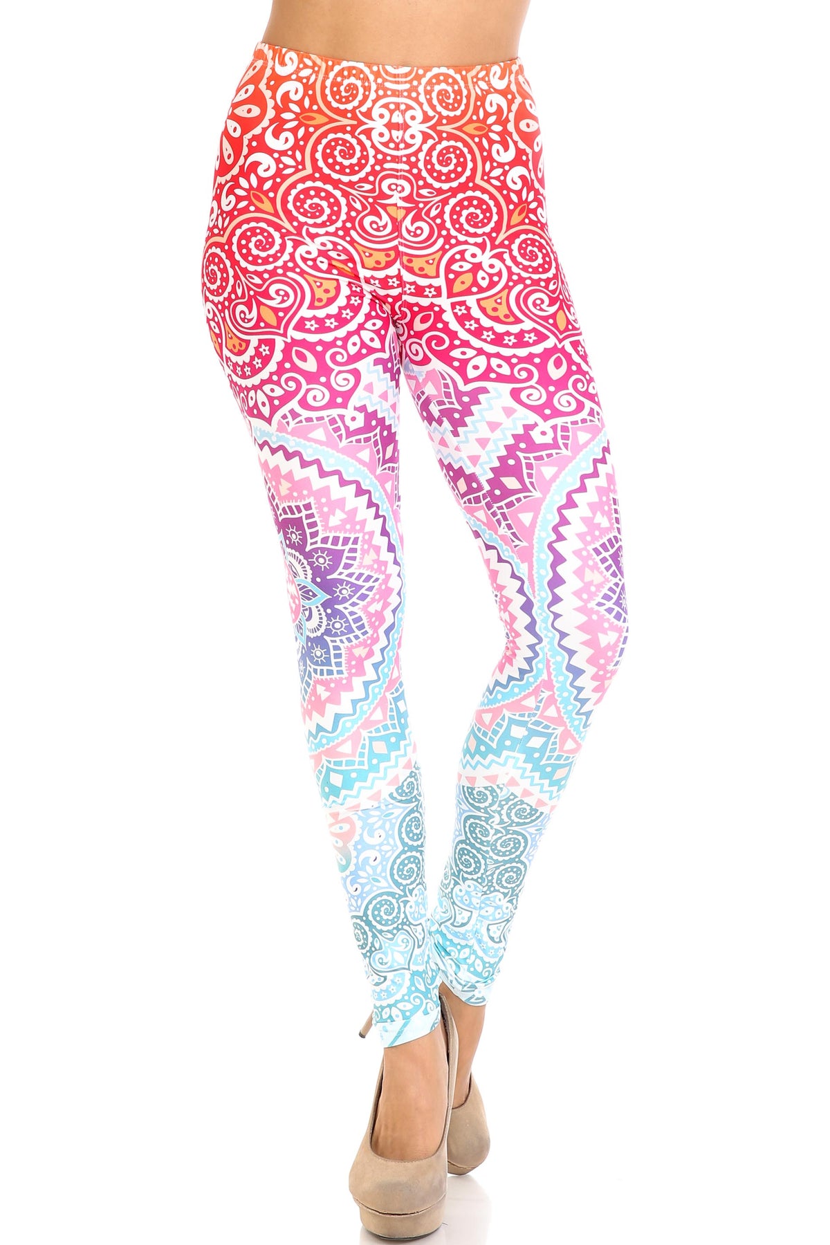 Make your outfit pop with these incredible Creamy Soft Ombre Mandala Aztec Leggings. The gorgeous white mandala design overlays a colorful ombre fabric base that requires nothing more than a basic solid tee to complete a stunning ensemble.