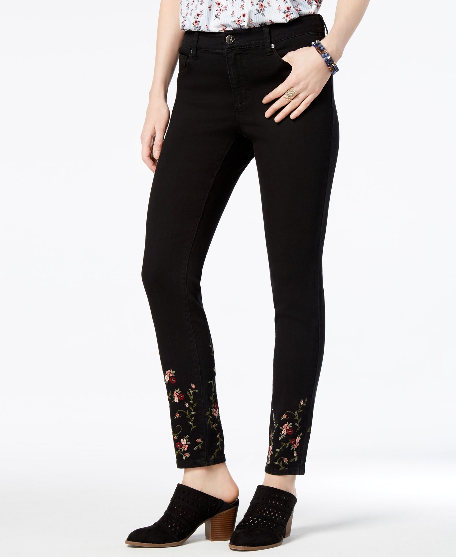 Style & Co's skinny ankle-length jeans are a sleek staple designed with floral embroidery on a classic black wash. Mid rise; skinny fit through hips and thighs; skinny leg Approx. inseam: 28" Front zipper and button closure; belt loops Classic 5-pocket styling Floral embroidered at hem Black wash Due to generous sizing, we suggest sizing down for the perfect fit Cotton/spandex Machine washable Imported