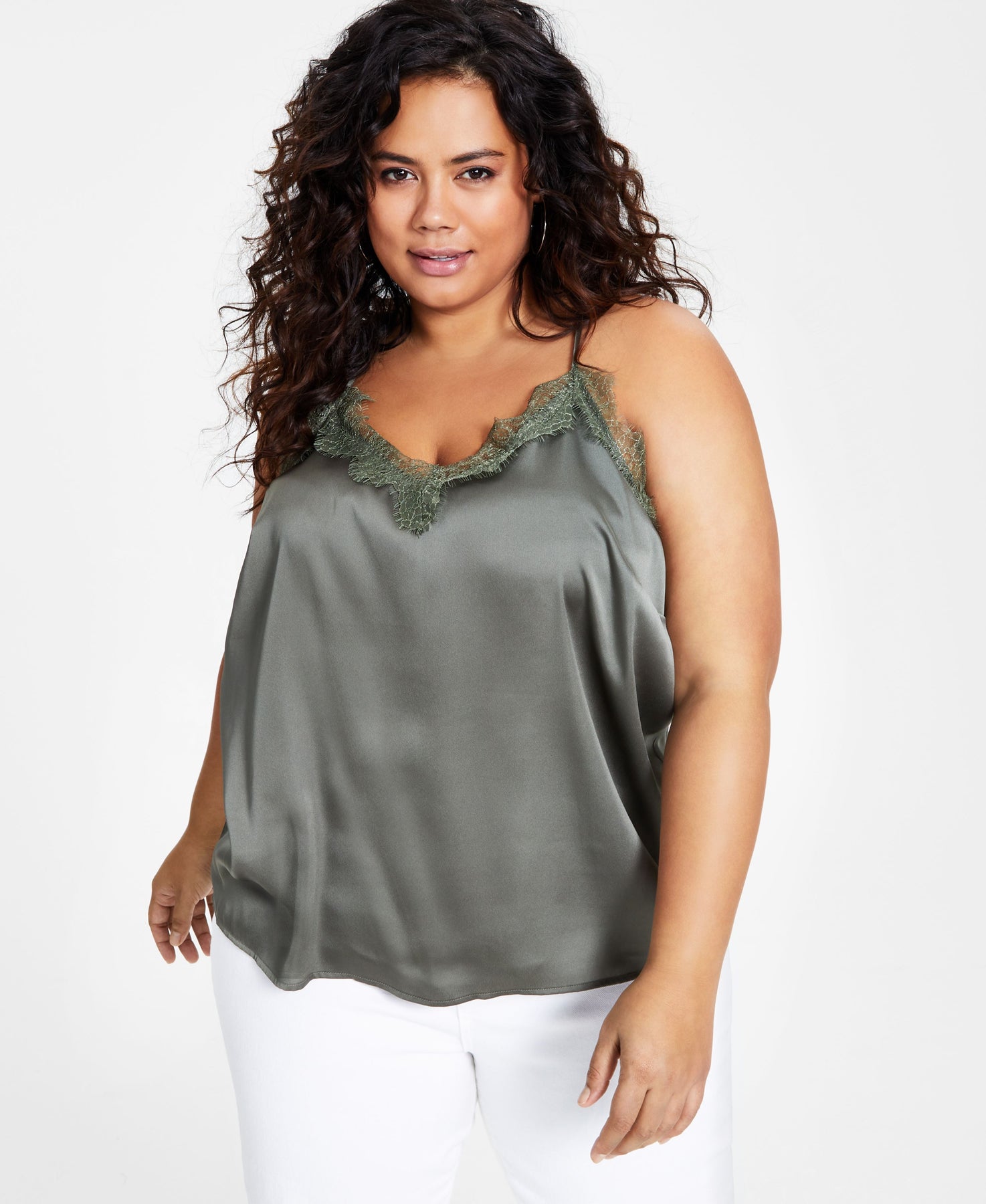 The lingerie look is trending, so score Bar III's plus size lace-trim camisole. Approx. model height is 5'10" and she is wearing size 2X Loose fit; hits at waist; approx. 22" long V-neck with lace trim; pullover styling Racerback 100% polyester; trim: nylon Machine washable Imported Web ID: 13238488