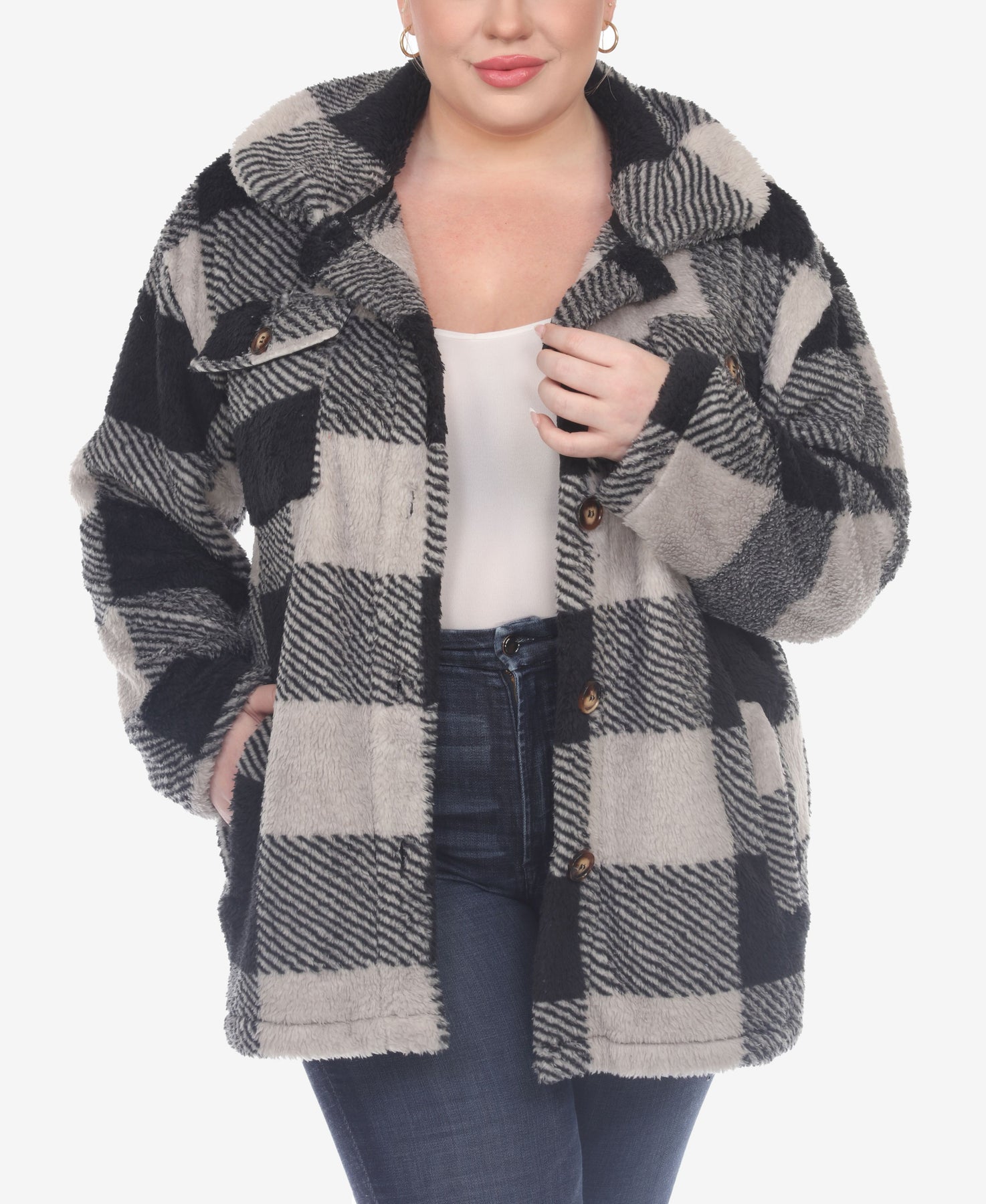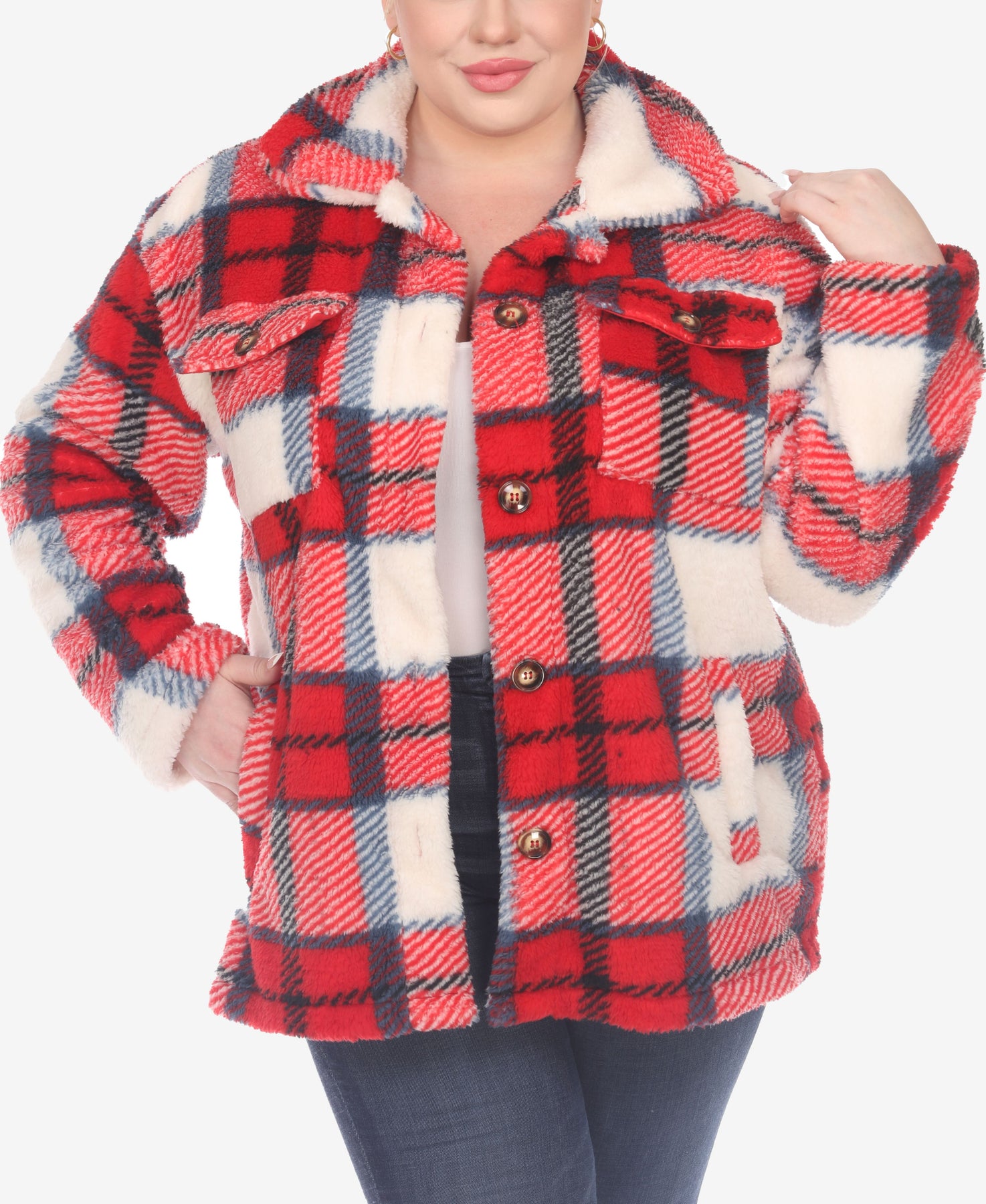 Update your cool-weather wardrobe essentials with this plaid shacket from White Mark. Crafted from the comfiest, lightweight and warm sherpa you will love wearing this stylish shacket all throughout the season. Features a spread collar flap front pocket to give it a classic look. Imported Relaxed shacket Approximately model height is 5'8" and she is wearing a size 1X Garment length - approximately 28" long Runs true to size, order your normal size 100% Polyester Machine Washable