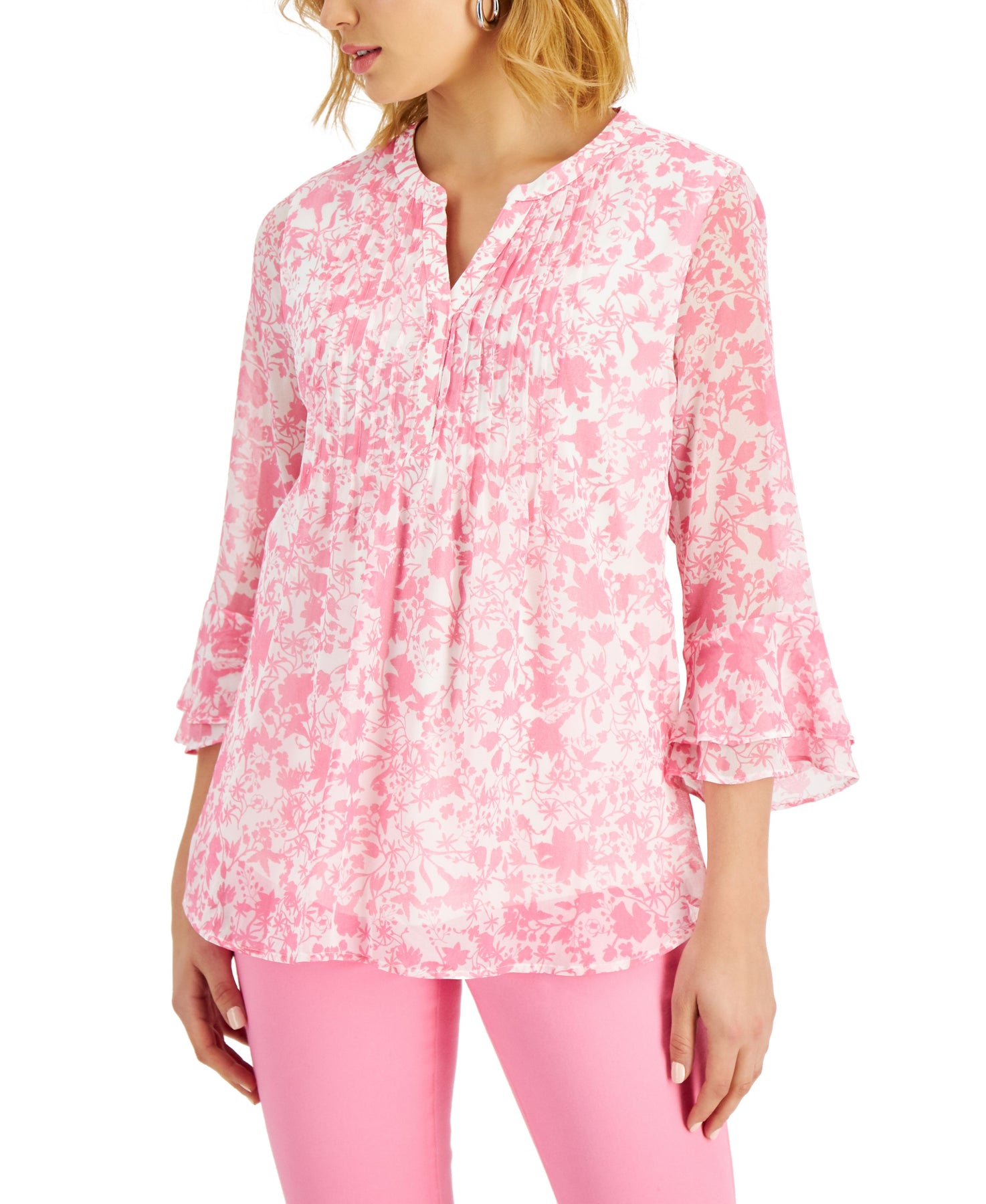Charter Club Petite Floral Print Flutter Sleeve Pintuck Top
