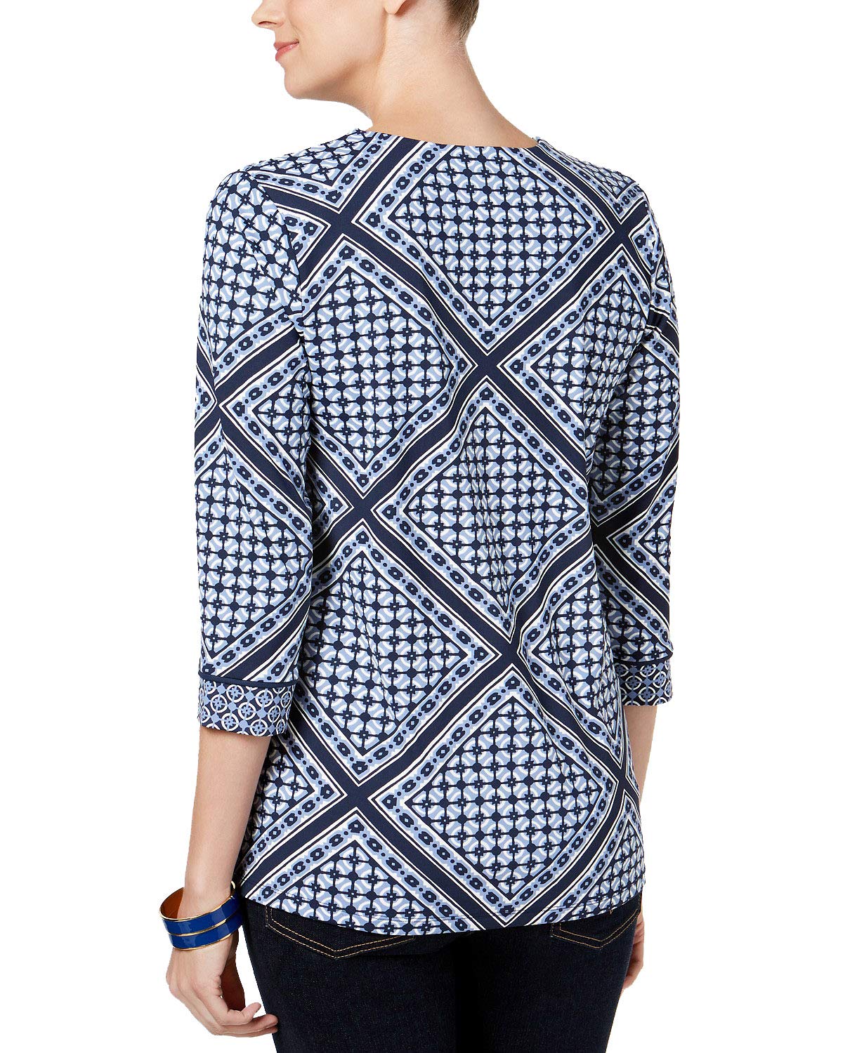 A contrast print adds interest and refinement to the neckline and sleeves of this striking geo-print petite top from Charter Club. V-neckline Contrast print at neckline and cuffs 3/4-sleeves Hits below hip Due to generous sizing, we suggest sizing down for the perfect fit Designed to fit and flatter 5'4" and under frame Styles are tailored for the petite customer, hits and fits at the right places specifically at wrist and ankle Nylon/spandex Machine washable Imported