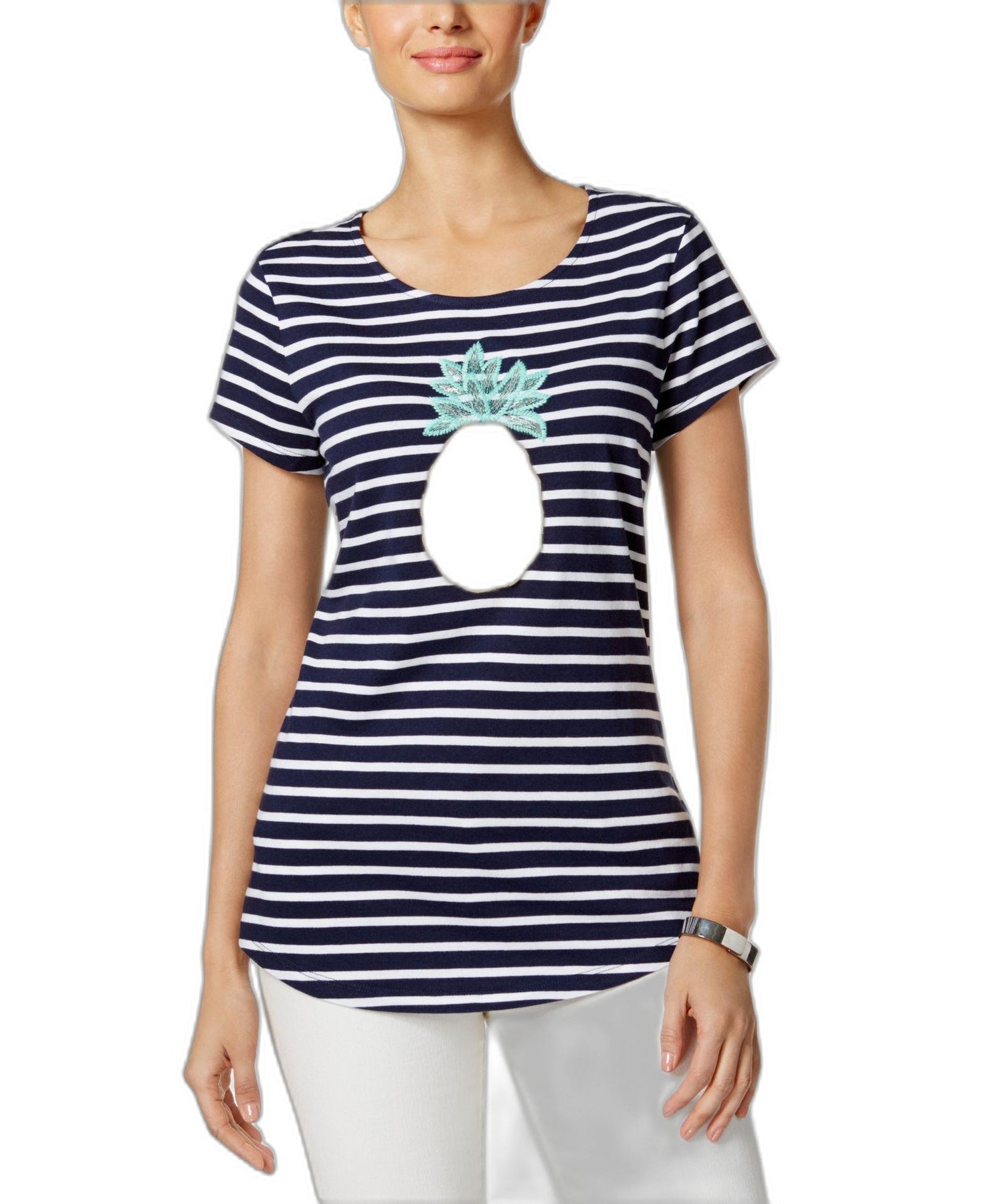 A bold embellished pineapple applique adds tropical inspiration to this classic striped petite top from Charter Club Crew neckline Embellished pineapple applique at chest; shirttail hem Hits at hip Cotton/modal Machine washable Imported