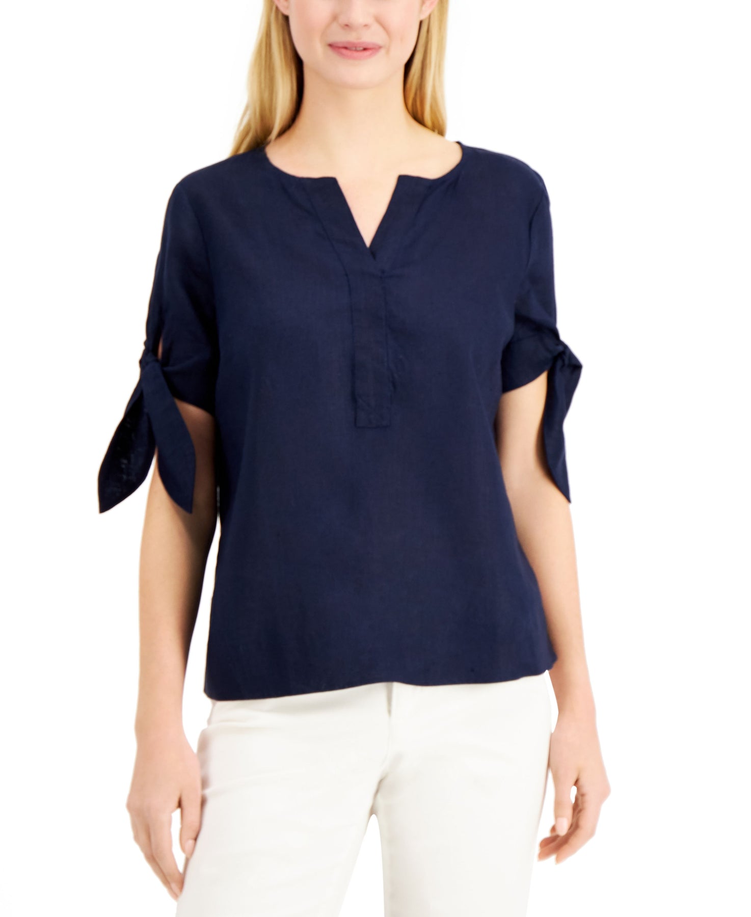 When you're looking for a light and breezy look that's stylish, this linen top from Charter Club is perfection. Vented hem; tie detail at cuffs Split neckline Imported