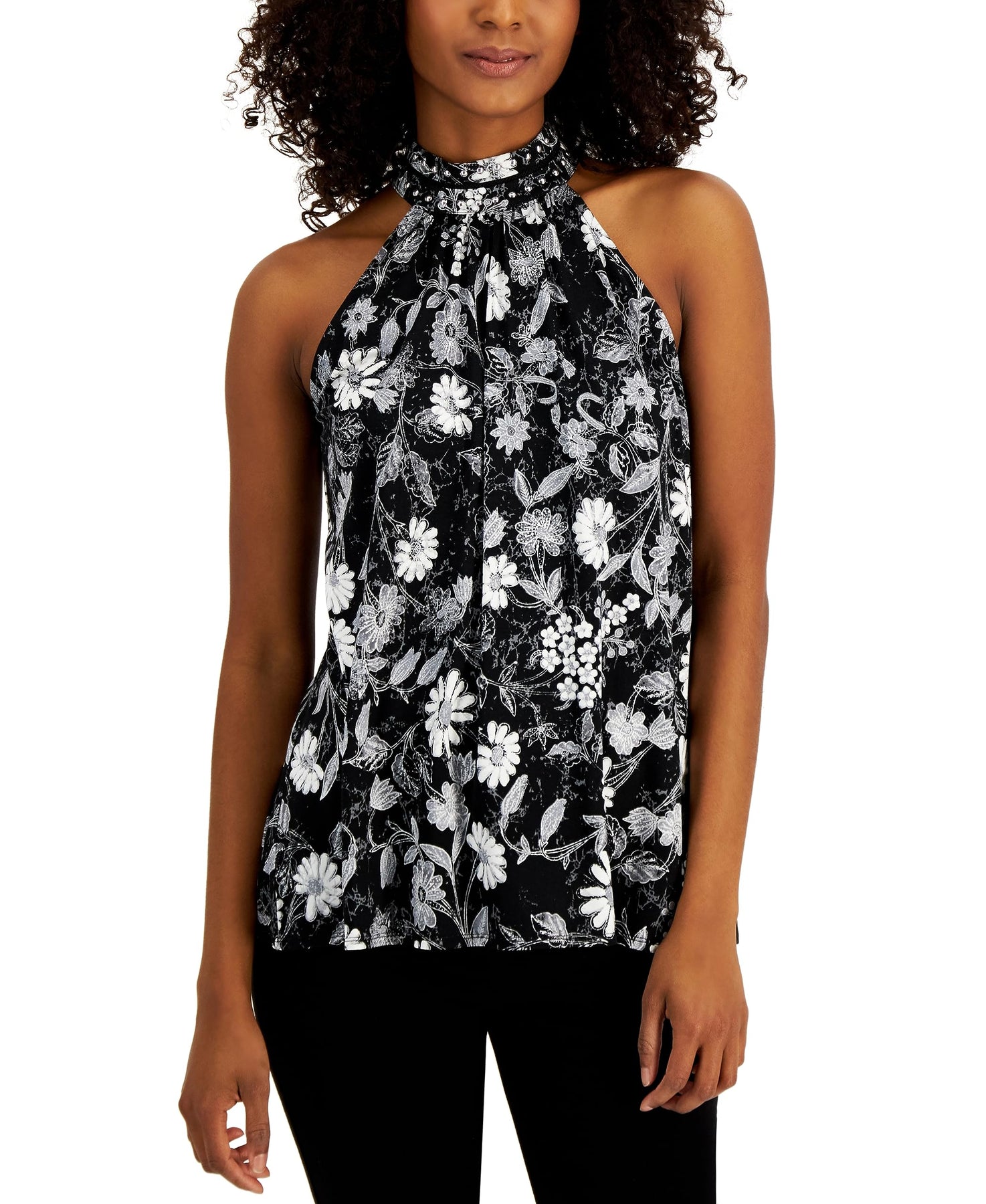 Shiny dome-shaped studs at the mock neck and shoulder-baring style accent the floral-print knit shape of this halter top from INC International Concepts. Relaxed fit High halter neckline with dome-stud and openwork trim; button closure at back neckline keyhole Rayon/spandex Machine washable Imported
