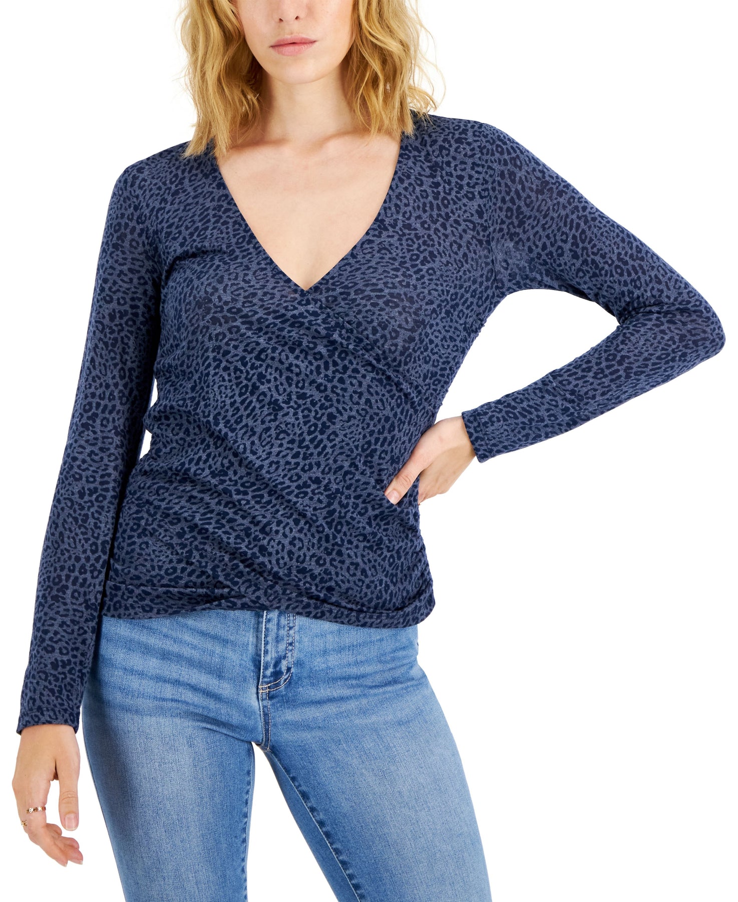 INC International Concepts Womens Leopard Print Long Sleeve Surplice Top