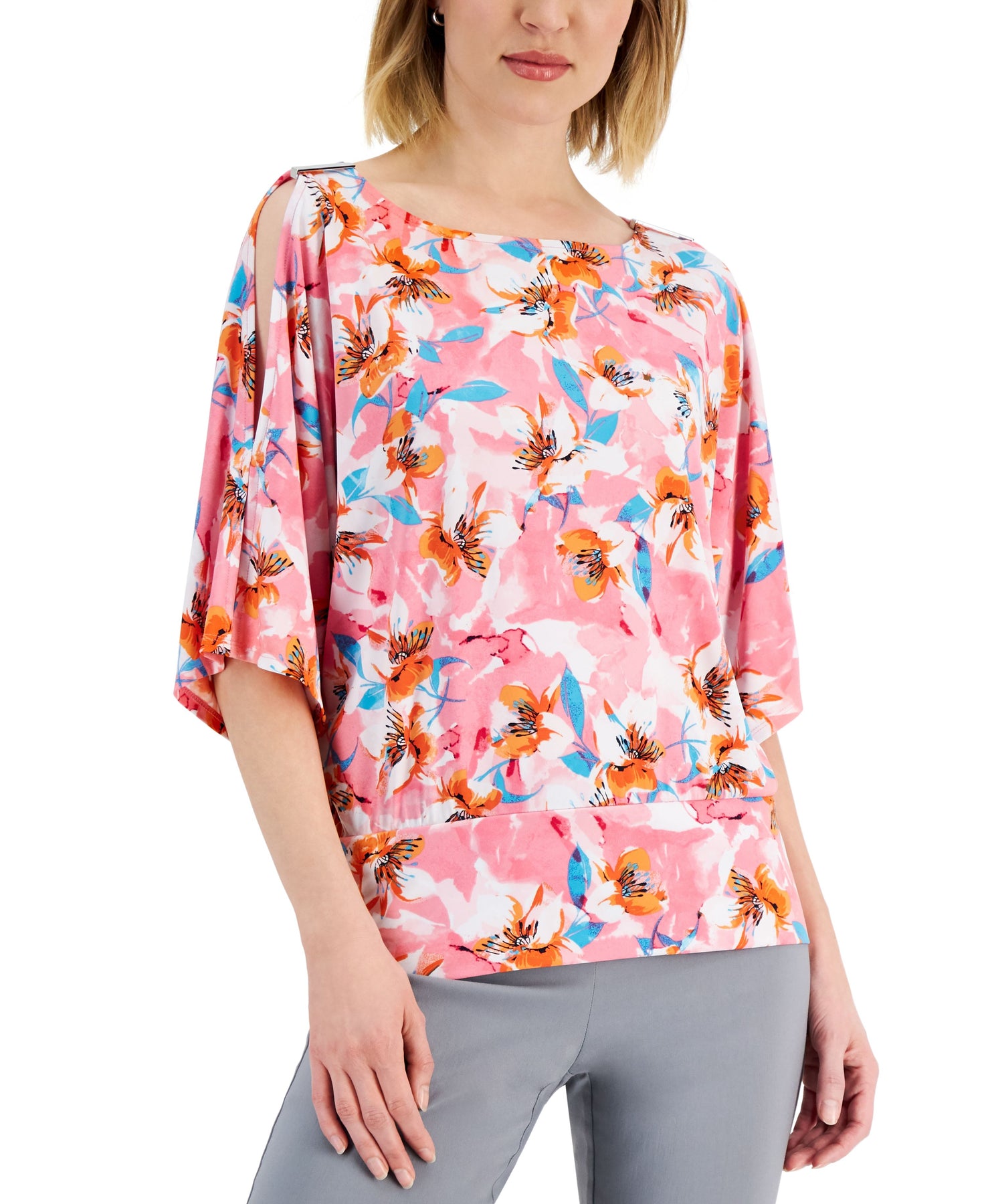 Give your look a pop of color and fun flair with this printed top from JM Collection, featuring split dolman-sleeves. Approx. 22-1/2" long Designed to fit and flatter 5'4" and under frame Boat neckline Dolman short sleeves with slits Polyester/spandex Machine washable Imported Web ID: 13707917