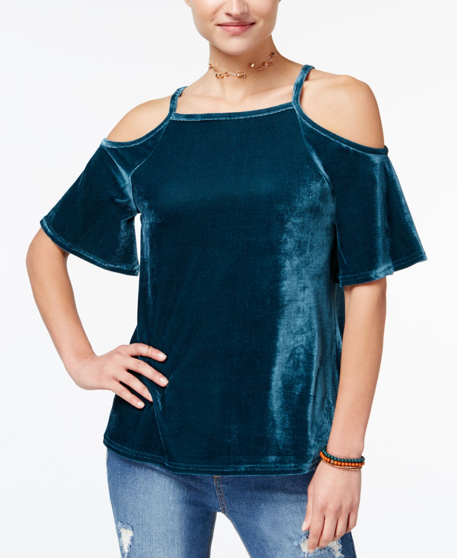 Dare to bare your shoulders in a dressy Ultra Flirt top that's stylish and velvet allover. Square neckline Approx. model measurements: height: 5'9-1/2"; bust: 32"; waist: 25"; hips: 34" Allover velvet; back keyhole Spaghetti straps & cold-shoulder short sleeves Easy fit; hits at hip Polyester/spandex Machine washable Imported Web ID: 5116904