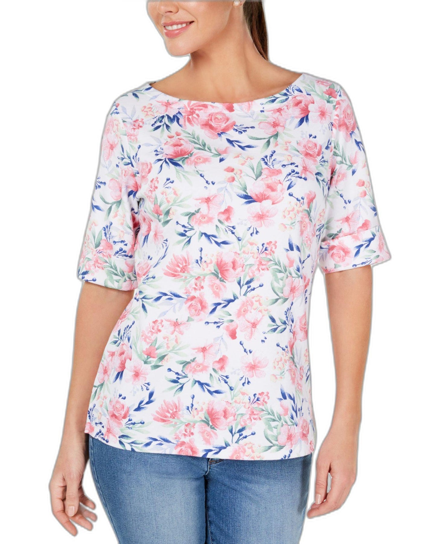 The refreshing printed knit of the Spring Oasis boat-neck top from Karen Scott is finished with cuffed elbow-length sleeves. Relaxed fit; hits at hip Due to generous sizing, we suggest sizing down for the perfect fit Boat neckline Cuffed elbow-length sleeves Cotton/polyester Machine washable Imported
