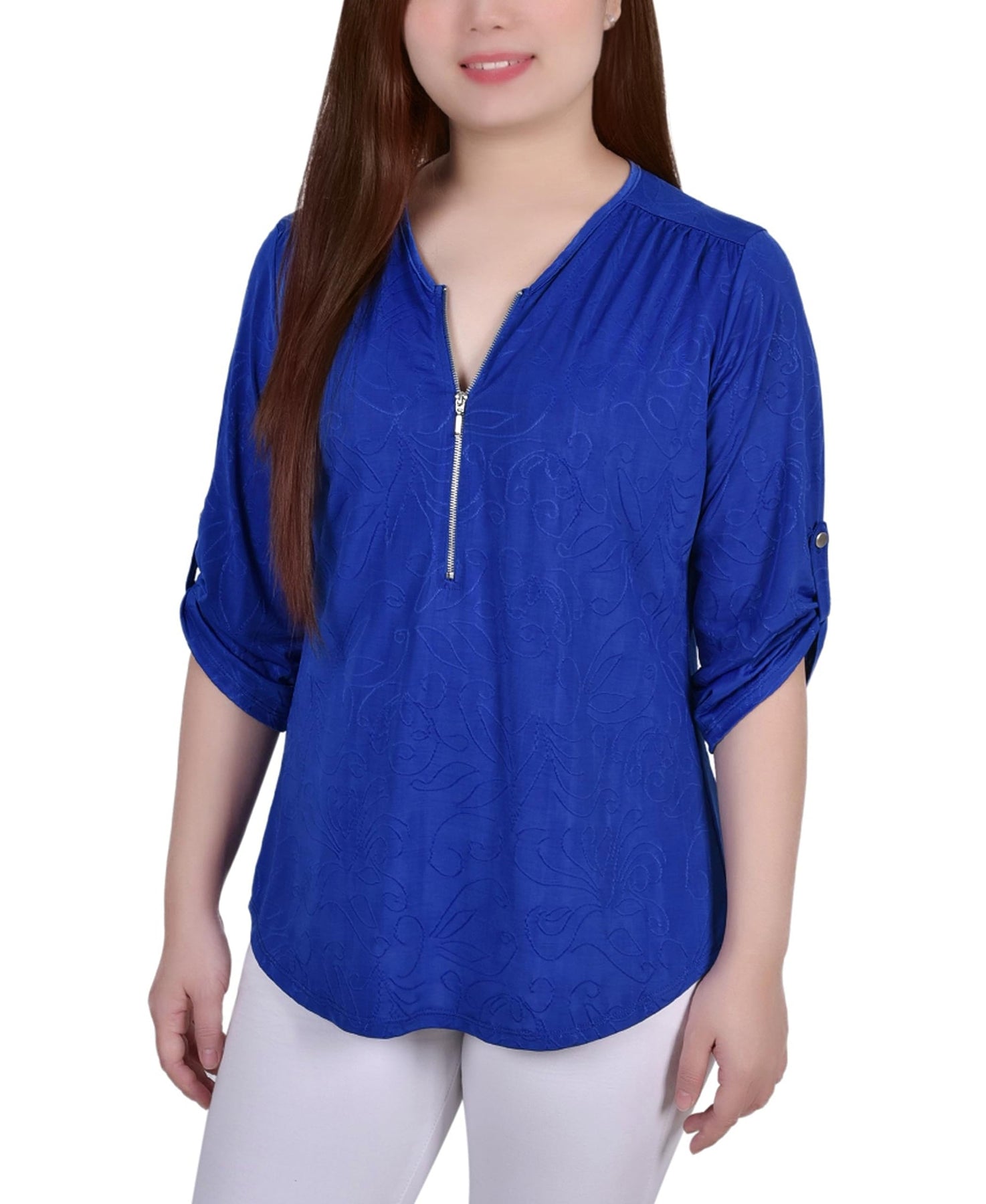 Petite 3/4 Roll Tab Zip Front Jacquard Knit Top