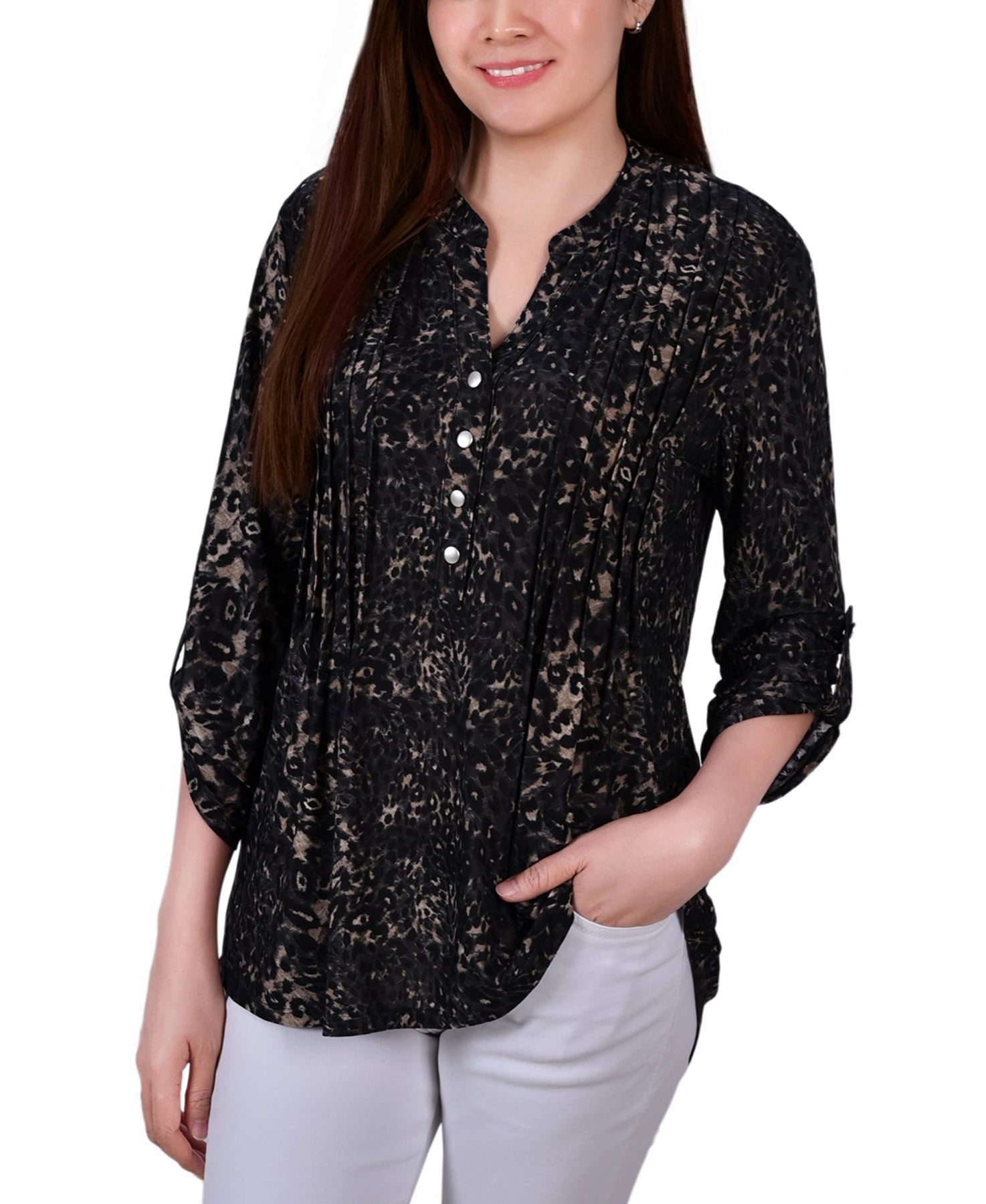With 3/4 roll tab sleeves and a button up detail, this NY Collection top is flattering on any woman. 3/4 roll tab sleeves Mandarin collar Y neck Pin tuck front Rounded hem Polyester, Spandex Machine Wash Cold Imported Web ID: 13511562