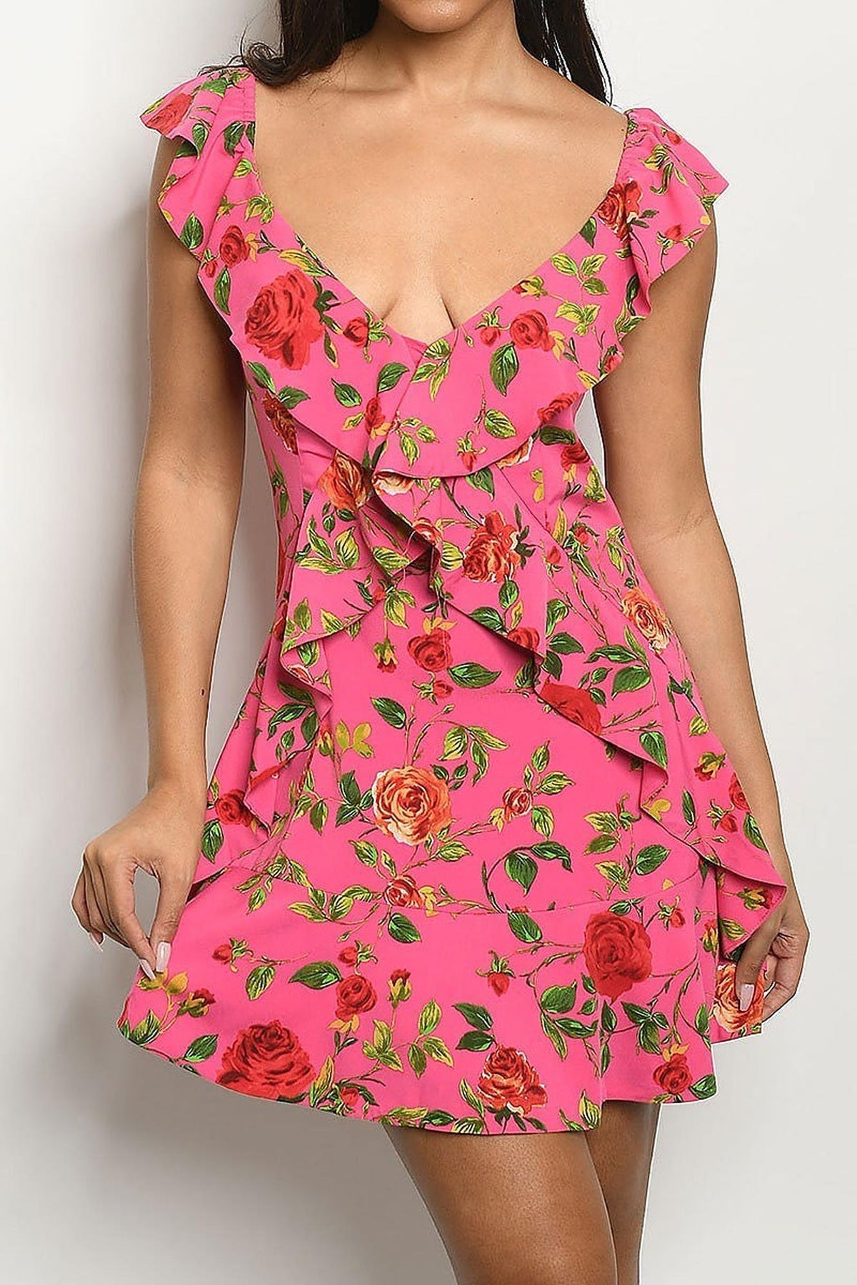 - A Trendy Deep Ruffle Accented V-Neck Floral Print Mini Dress with a Flounced Hem and Ruffling Throughout