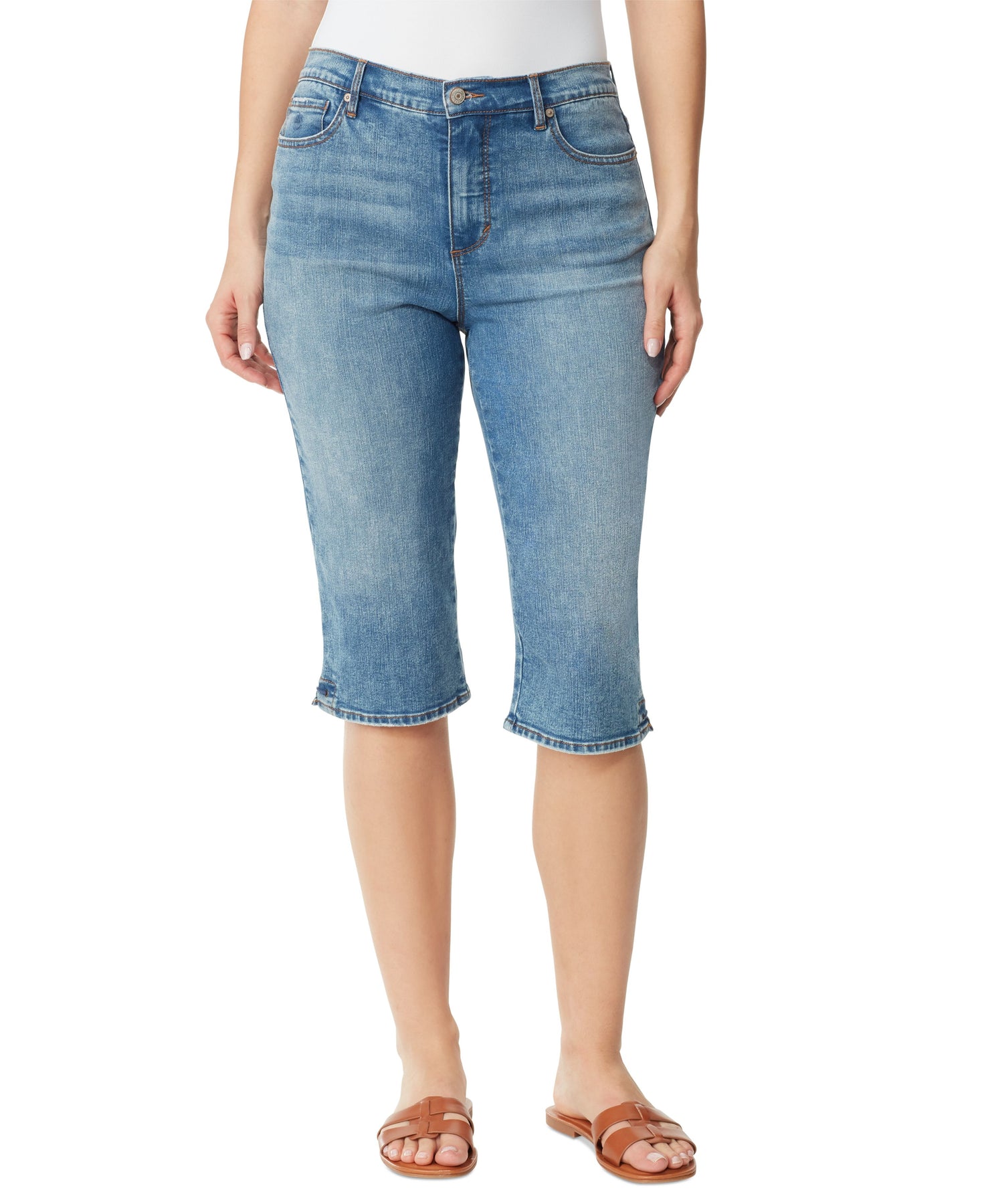 Curvy through the thighs and tapered at the legs, these Gloria Vanderbilt capri jeans offer a sleek fit and classic high rise. Approx. inseam: 16-1/2" Approx. rise: 11-1/4" Zipper and button closure at front; belt loops Allover fading Cotton/spandex Machine washable Imported