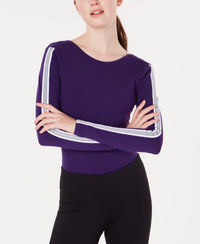 Sporty stripes with shine details make Material Girl Active's long-sleeved bodysuit a necessity when you want a sleek athleisure look. Fitted silhouette Scoop neckline; snap closure at gusset Shine stripe details at sleeves; deep U back Cotton/spandex Machine washable Imported Web ID: 7080075