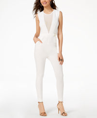 Jump into a current look with Material Girl's slim-fitting jumpsuit, fashioned with front illusion styling and an attached half belt. Hits at ankle; approx. inseam: 28" Back zipper closure Two side pockets Round neckline; Deep V front with illusion styling Slim fit Attached half belt with D-ring closures Shell: rayon/nylon/spandex; lining: polyester; mesh: nylon/spandex Machine washable Imported