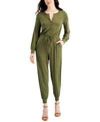 A cinched, self-tie detail defines the waist of this petite knit jumpsuit from Style & Co. Pair this effortless look with heeled sandals for elevated style. Approx. model measurements: height: 5'10"; bust: 31-1/2"; waist: 24"; hips: 35" Approx. inseam: 26-1/2" New and improved fit; please reference size chart Designed to fit and flatter 5'4" and under frame Round neckline; button closures at bodice Cinched, self-tie detail at waist Slant pockets at hips Rayon/spandex Machine washable Imported Web ID: 13518245