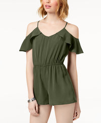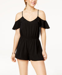 Bring some drama to your daytime look with Be Bop's relaxed romper, detailed with flutter sleeves and cold-shoulder styling. Approx. inseam: 2" 10" rise Relaxed fit Pull-on style with self ties at back V neckline Short flutter sleeves with cold-shoulder styling; spaghetti straps Approx. model measurements: height: 5'9-1/2"; bust: 32"; waist: 25"; hips: 34" Polyester Hand wash Imported