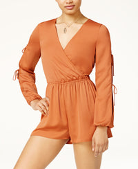 Bring breezy cool-girl edge to your wardrobe with this surplice romper from Material Girl, finished with unique cutout long sleeves for added dimension. Hits at mid-thigh; approx. inseam: 2" Pull-on styling; button closure at keyhole back Surplice V-neckline Elastic waist; ties and gathered cuffs at long sleeves Polyester Machine washable Imported