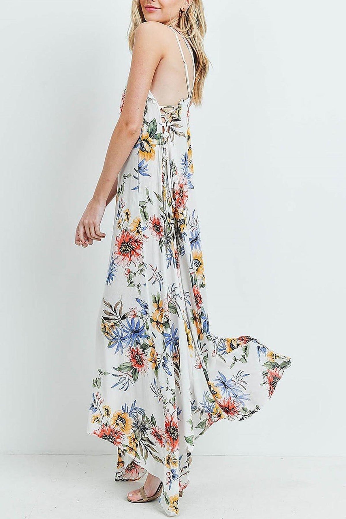 Floral Flounce Asymmetrical Hem Maxi Dress with Crisscross Back