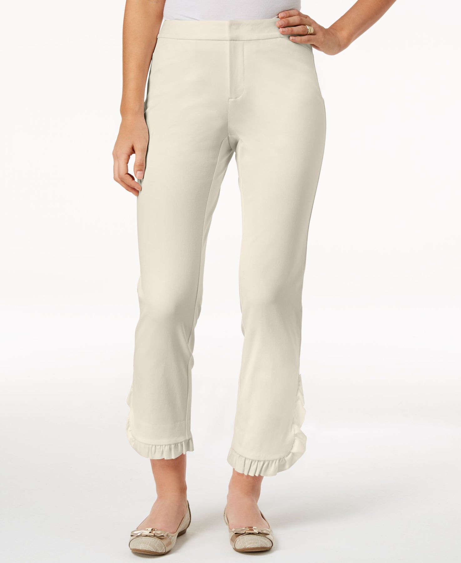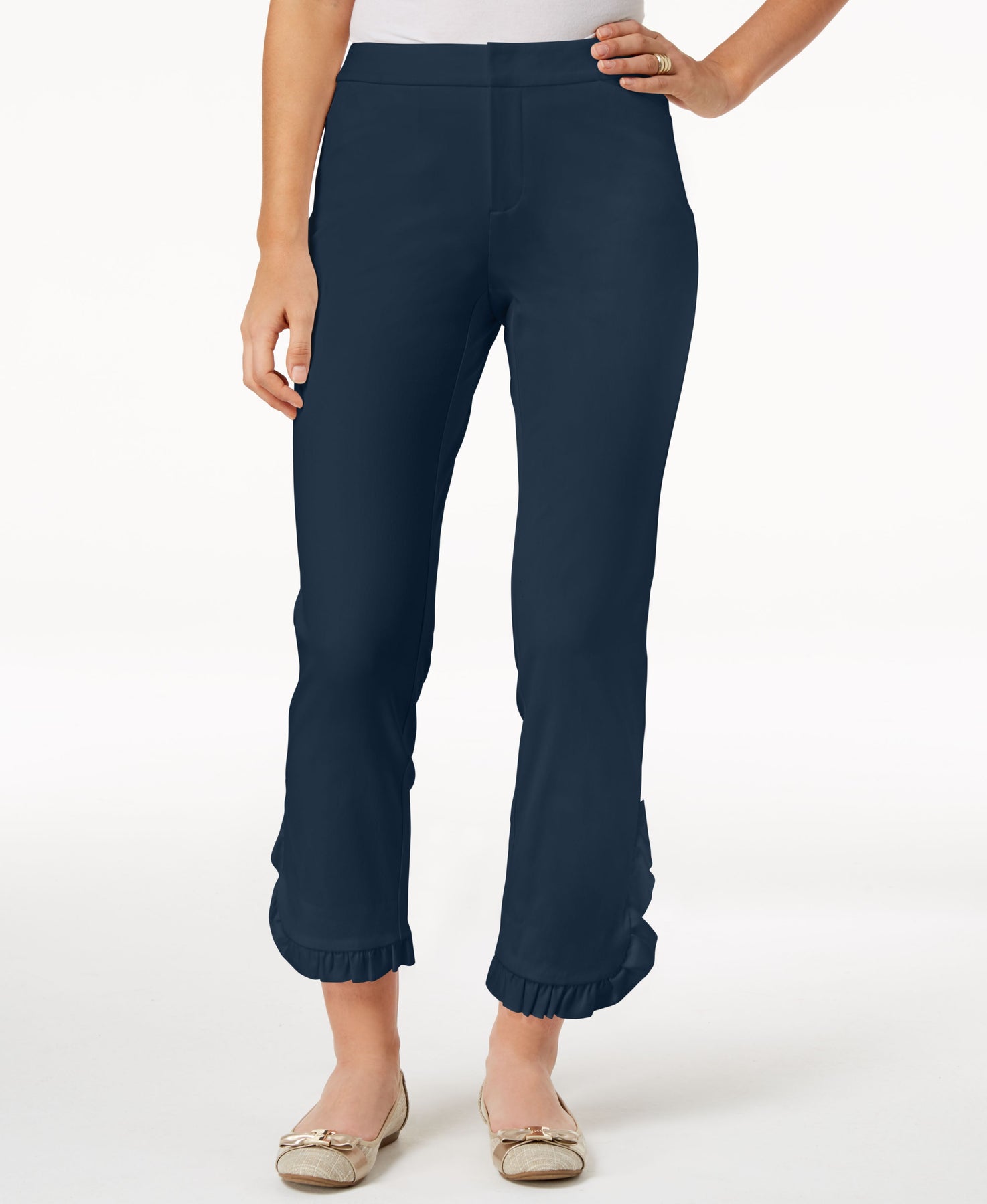 A ruffled hem lends a playful finish to these cropped Charter Club pants, styled with a comfortable mid rise and built-in tummy-control panel. Approx. model measurements: height: 5'10"; bust: 31-1/2"; waist: 24"; hips: 35" Approx. inseam: 25" Mid rise; regular fit through hips and thighs; cropped straight leg Due to generous sizing, we suggest sizing down for the perfect fit Front zipper with hook-and-bar closure; belt loops Two pockets at front; two besom pockets at back Tummy-control panel; ruffled hem Cotton/rayon/spandex/nylon Machine washable Imported