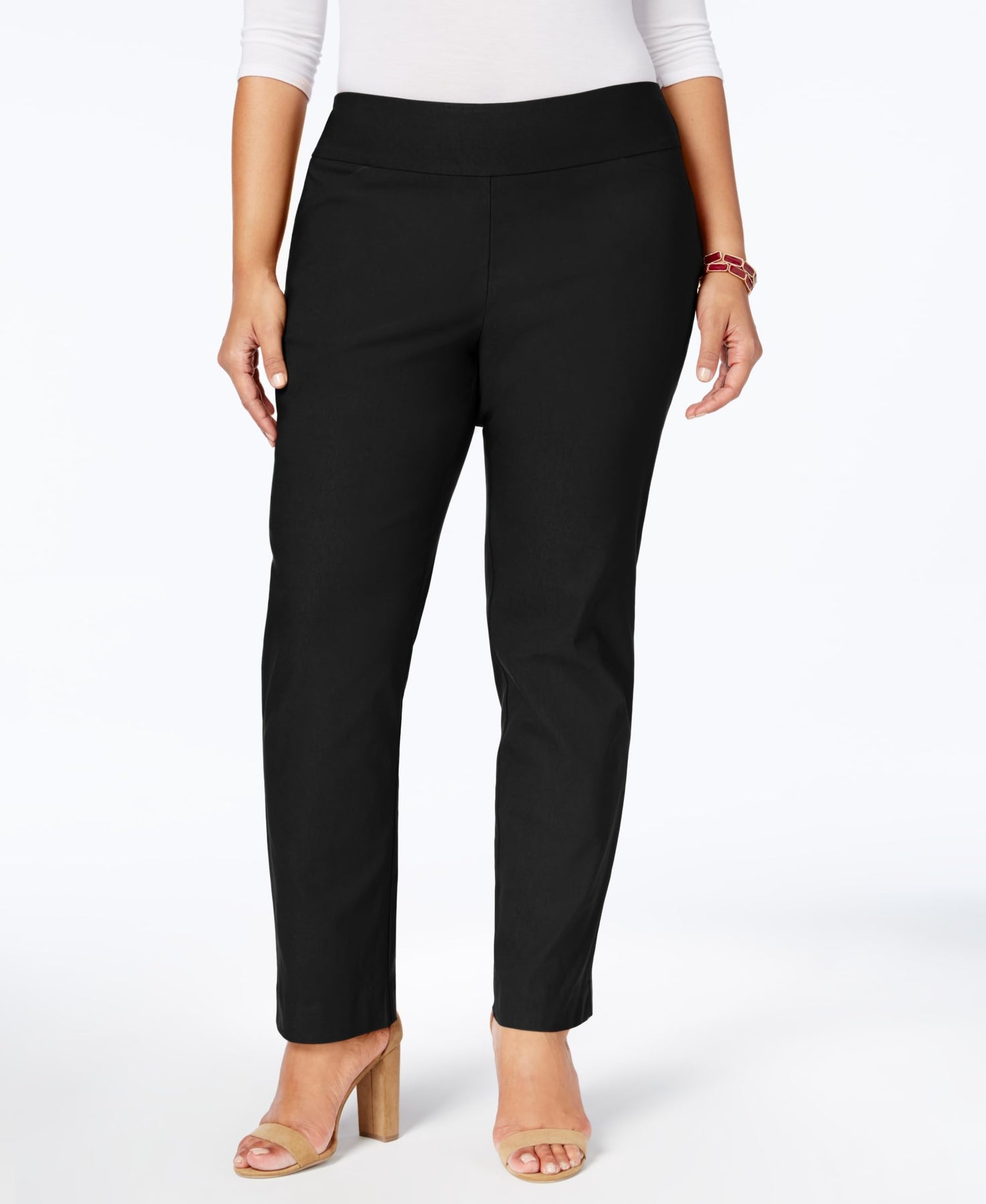 Charter Club's slim-leg plus size pants are a day-to-play staple, featuring a control panel for a flattering fit. Find the perfect fit. Click on our shaping video in the photo today! Approximate inseam: 28 inches (WP) Mid rise: waistband sits below natural waist; Slim fit through hips and thighs; slim leg Control panel smoothes tummy Pull-on styling; wide elastic waistband Petite plus sizes designed to fit and flatter 5'4" and under frame Body: rayon/nylon/spandex: panel: nylon/spandex Machine washable Imported