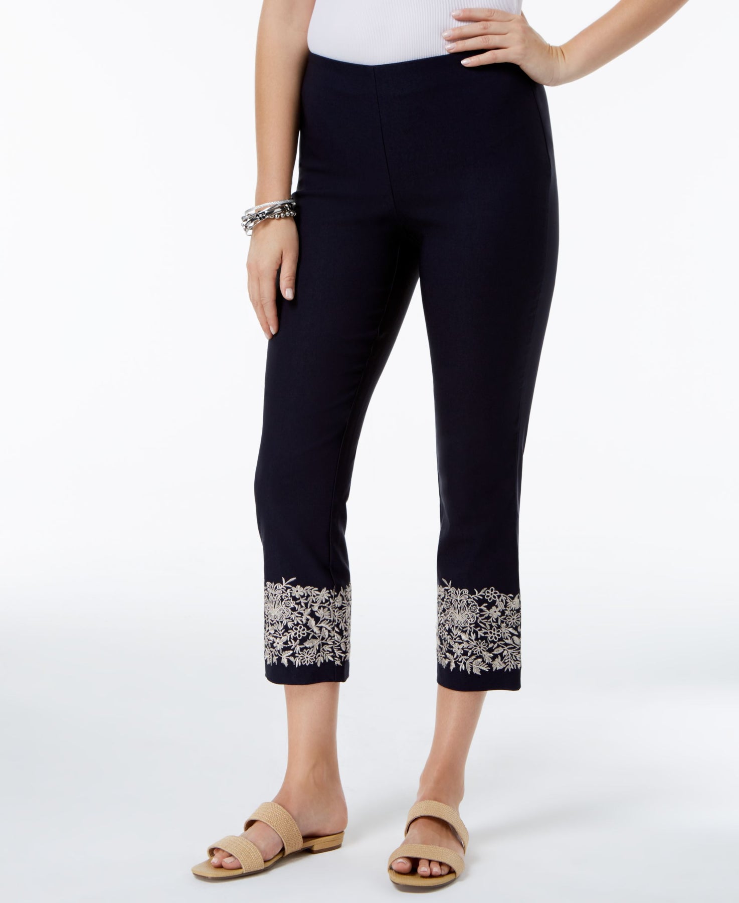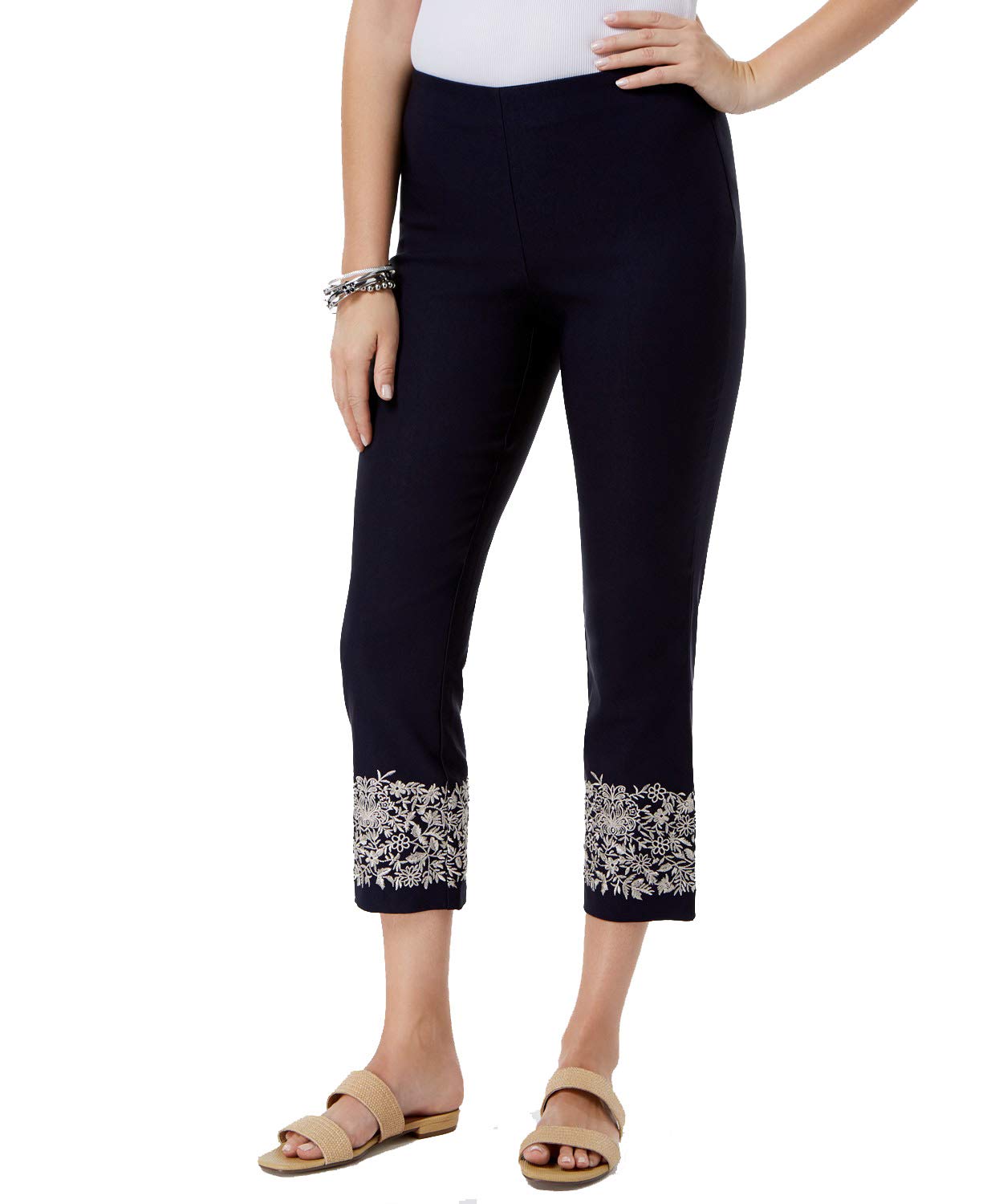 Pull-on styling and a tummy-control panel create a smooth silhouette for these cropped pants from Charter Club, finished with a lovely embroidered hem. Approx. model height is 5'10" and she is wearing a size 4 Approx. inseam: 25" Mid rise; skinny fit through hips and thighs; straight leg hits at mid-calf Due to generous sizing, we suggest sizing down for the perfect fit Pull-on style Embroidery details at hem; tummy control panel at front Rayon/nylon/spandex Machine washable Imported