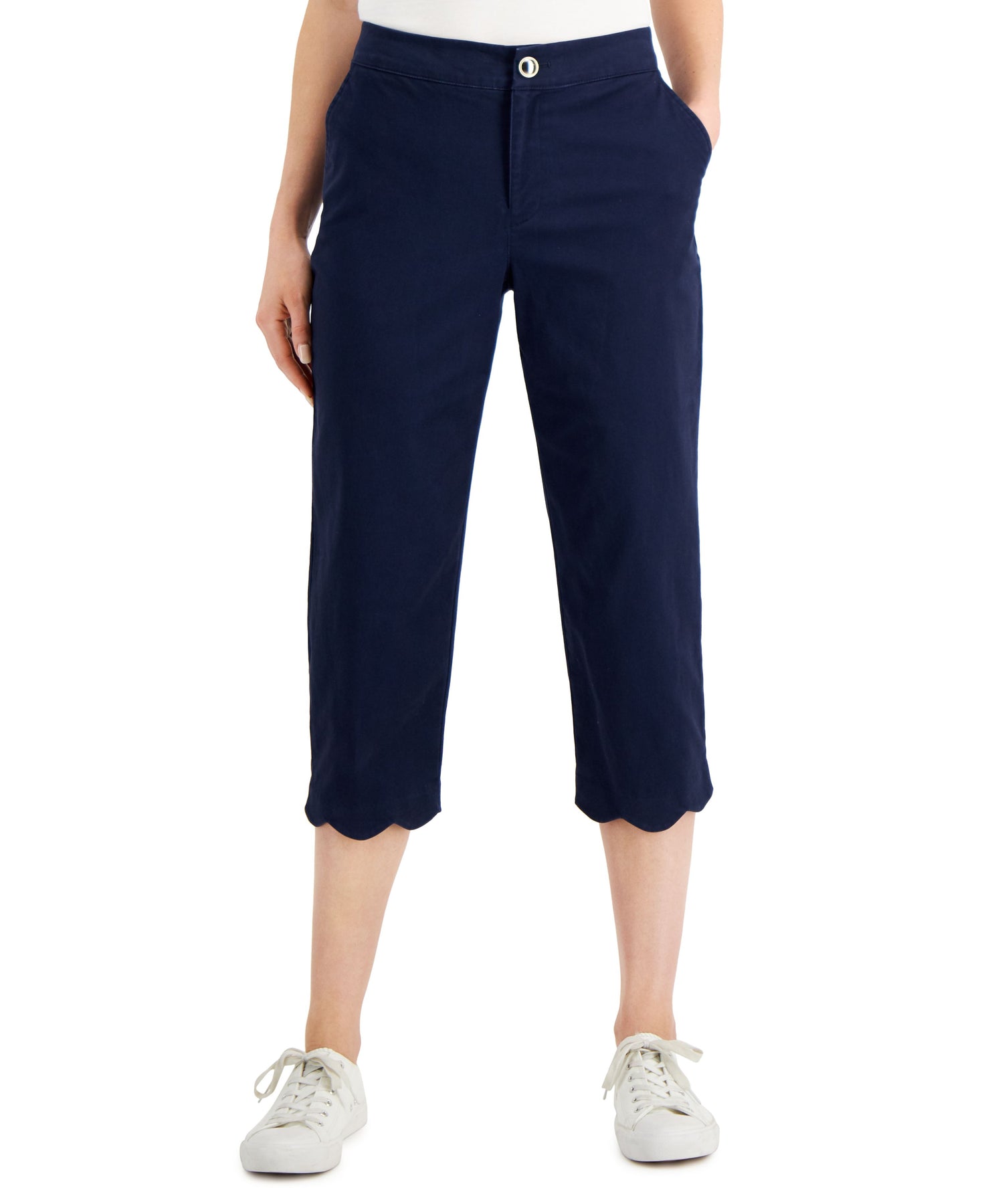 A scalloped hem adds a fun finish to these stylish pants from Charter Club, comfy capris with the perfect amount of stretch. Approx. model height is 5'10" Approx. inseam: 23"; capri length Approx. rise: 10-1/2" Due to generous sizing, we suggest sizing down for the perfect fit Zipper and button closure Scalloped hem Slant pockets at front; welt pockets at back Cotton/spandex Machine washable Imported Web ID: 13683939