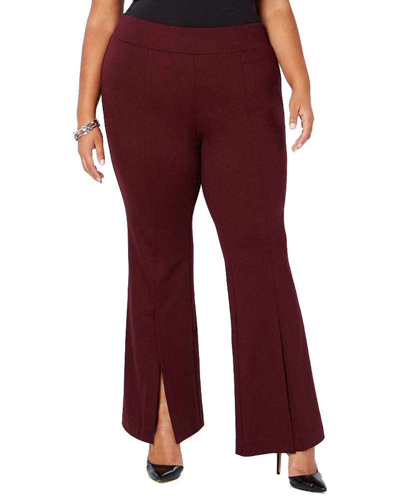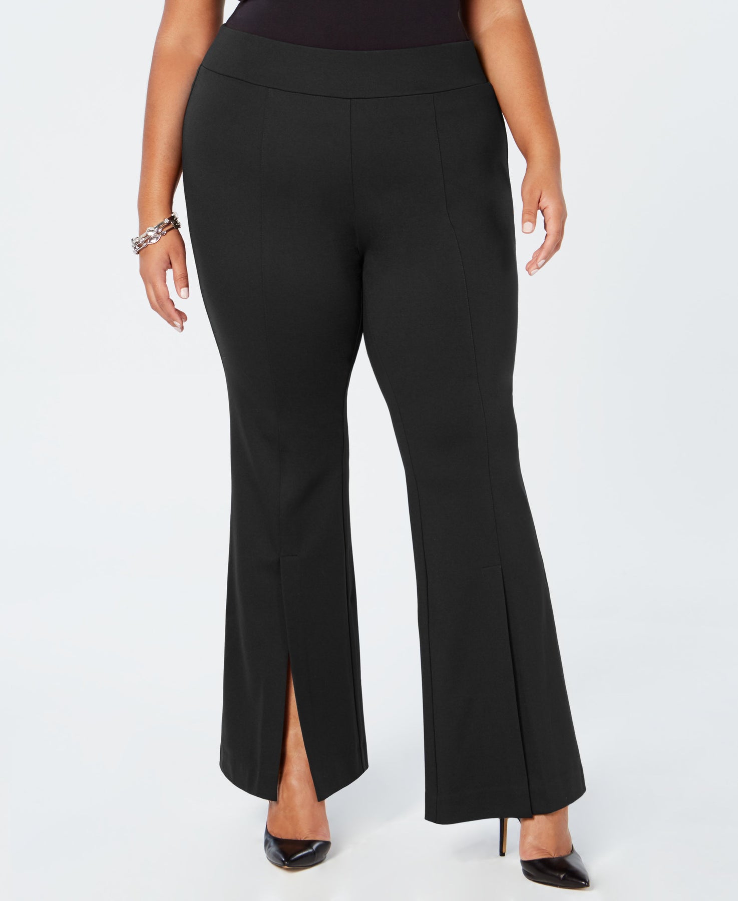 Capture a contemporary look with these plus size pull-on pants from I.N.C. International Concepts, designed with a curvy flare-leg silhouette and slit front hems. Approx. model height is 5'10" and she is wearing a size 18W Approx. inseam: 33" Mid rise; regular fit through hips and thighs; flare leg Pull-on style Slit at front hems Rayon/nylon/spandex Machine washable Imported Web ID: 6847397
