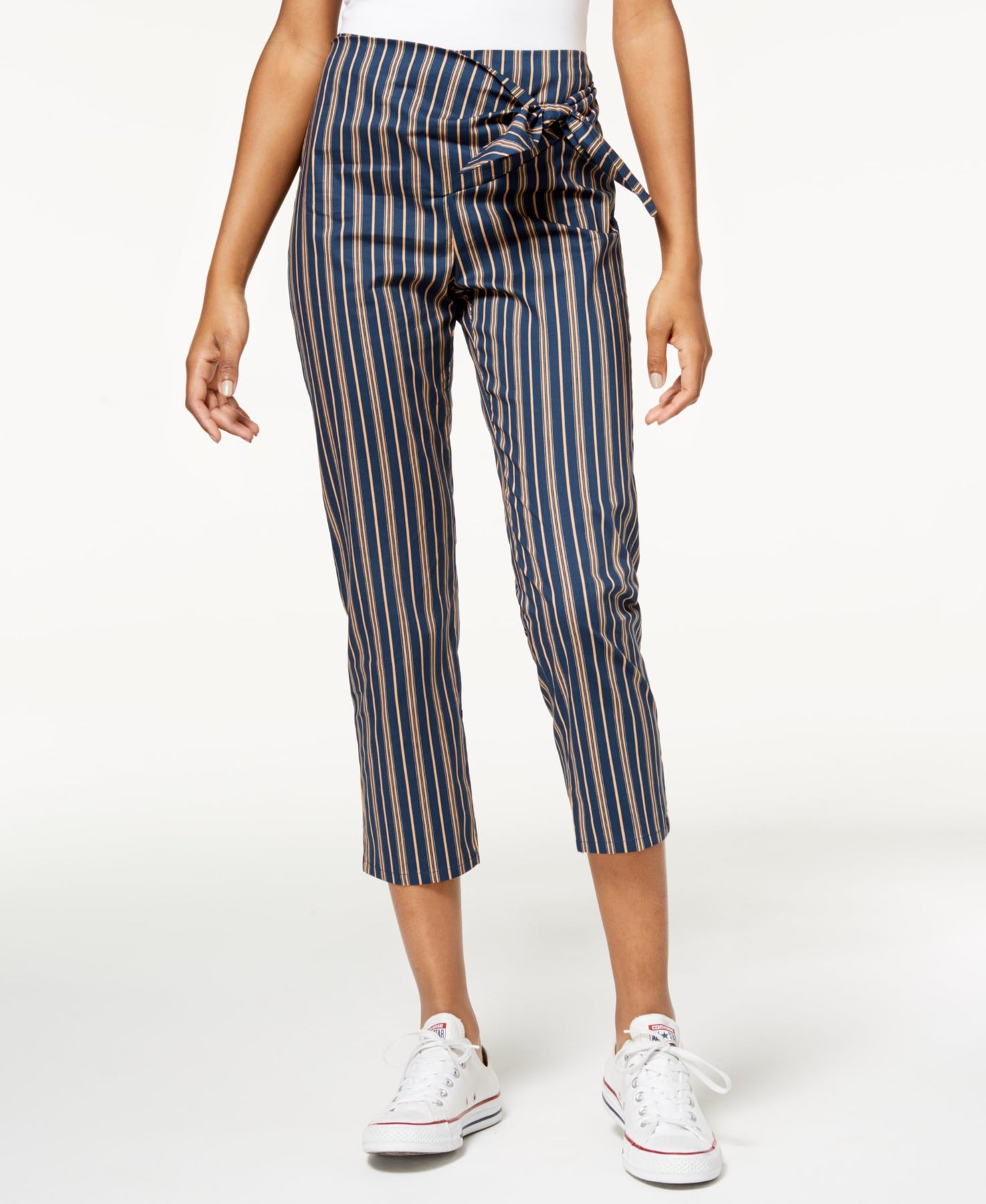 Be Bop's striped pull-on pants rock a fashion-forward look with a tie waist and ankle-showing length. Approx. inseam: 23-1/2" Front rise: approx. 10" Pull-on style; elastic waist Self tie at front Polyester/spandex Hand wash Imported Web ID: 6424330