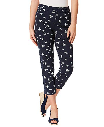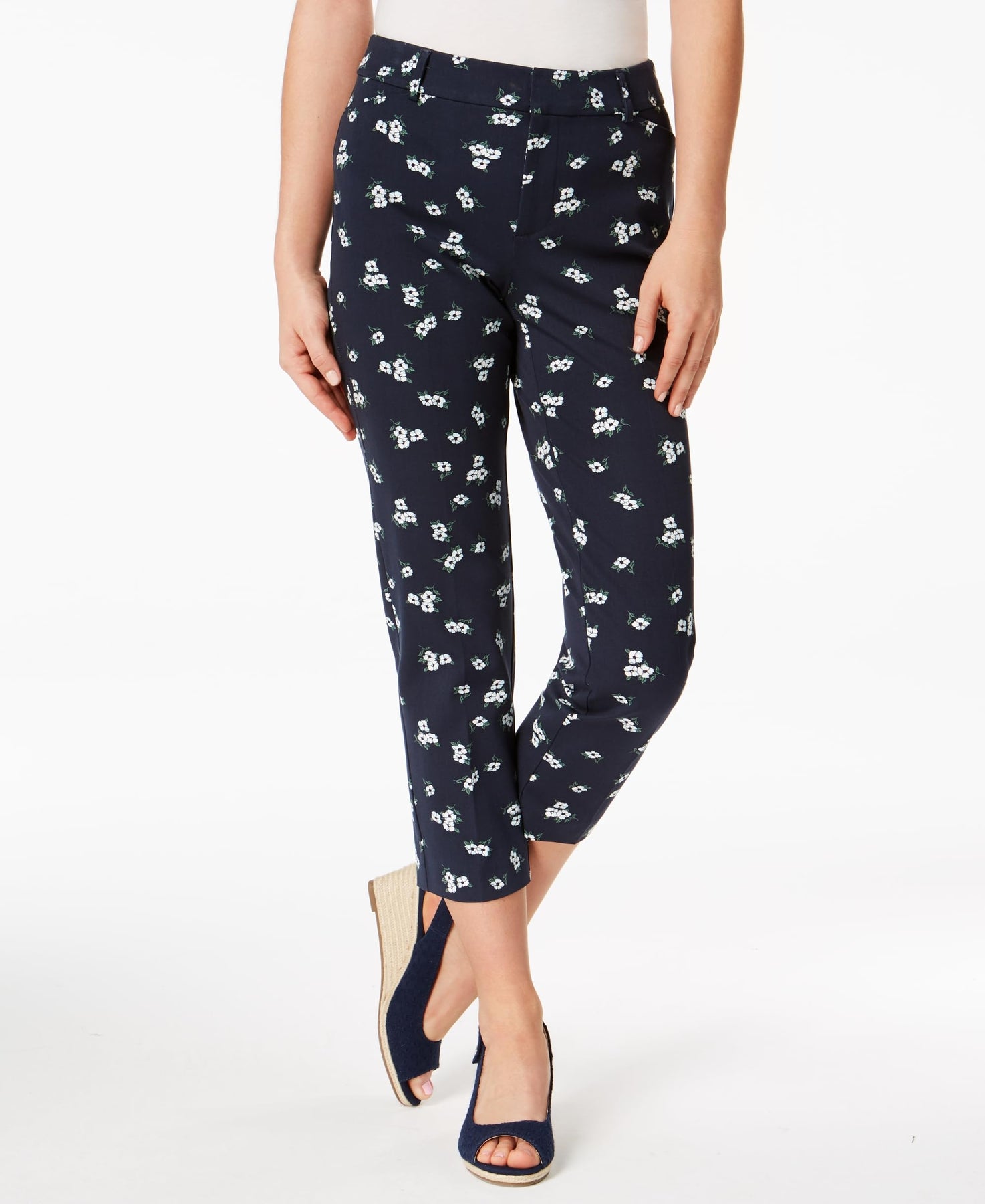 A nautical sailboat print decorates these slim-fit cropped pants from Charter Club for a classic and polished aesthetic. Mid rise; regular fit through hips and thighs; slim cropped leg Approx. model measurements: height: 5'10"; bust: 35-1/2"; waist: 27"; hips: 35" Approx. inseam: 25” Zipper with hook & bar closure; belt loops Side seam slash pockets; back besom pockets Slimming tummy panel Cotton/rayon/spandex Machine washable Imported Web ID: 5671402