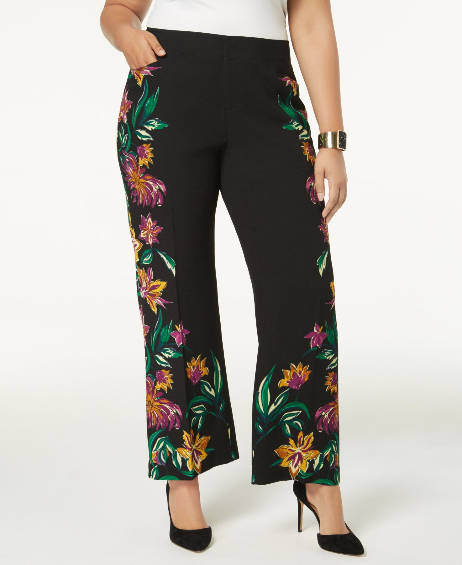 A sleek pair of plus size pants gets a whole new look from INC International Concepts. This wide-leg silhouette is updated with a colorful floral print that runs down both sides. High rise; straight fit through hips and thighs; wide leg Approximate model measurements: Height: 5'10"; Bust: 38"; Waist: 34"; Hips: 45" Approx. inseam: 32" Zipper with hook-and-bar closure at front Off-seam pockets at hips Floral print at sides Polyester Machine washable Imported