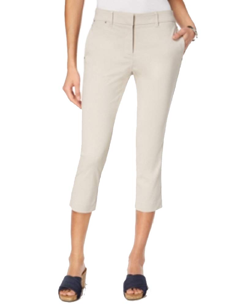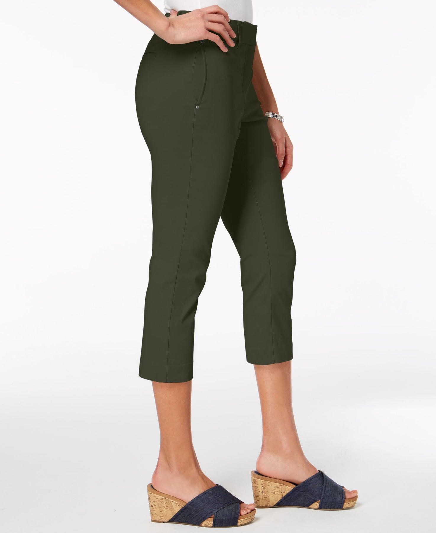 Create an effortless, crisp look in these casual capri pants from Style & Co, designed with a cropped straight-leg silhouette and a comfortable mid rise. Approx. model measurements: height: 5'10"; bust: 35-1/2"; waist: 27"; hips: 35" Approx. inseam: 23" Mid rise; straight fit through hips and thighs; straight leg cropped at mid-calf Due to generous sizing, we suggest sizing down for the perfect fit Front zipper with hook-and-bar closure; belt loops On-seam pockets at front; welt pockets at back Seaming and rivet details Rayon/nylon/spandex Machine washable Imported Web ID: 5099210