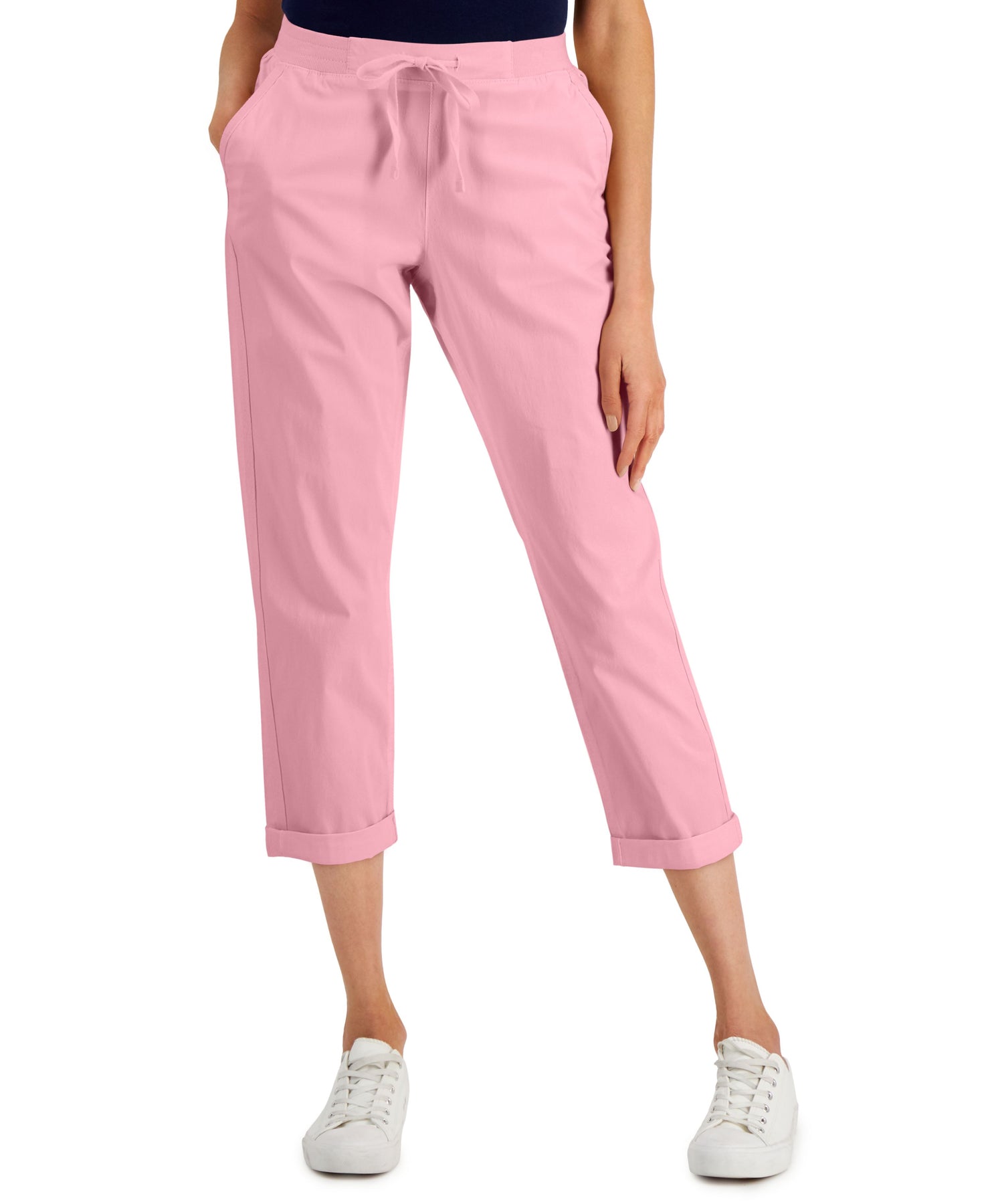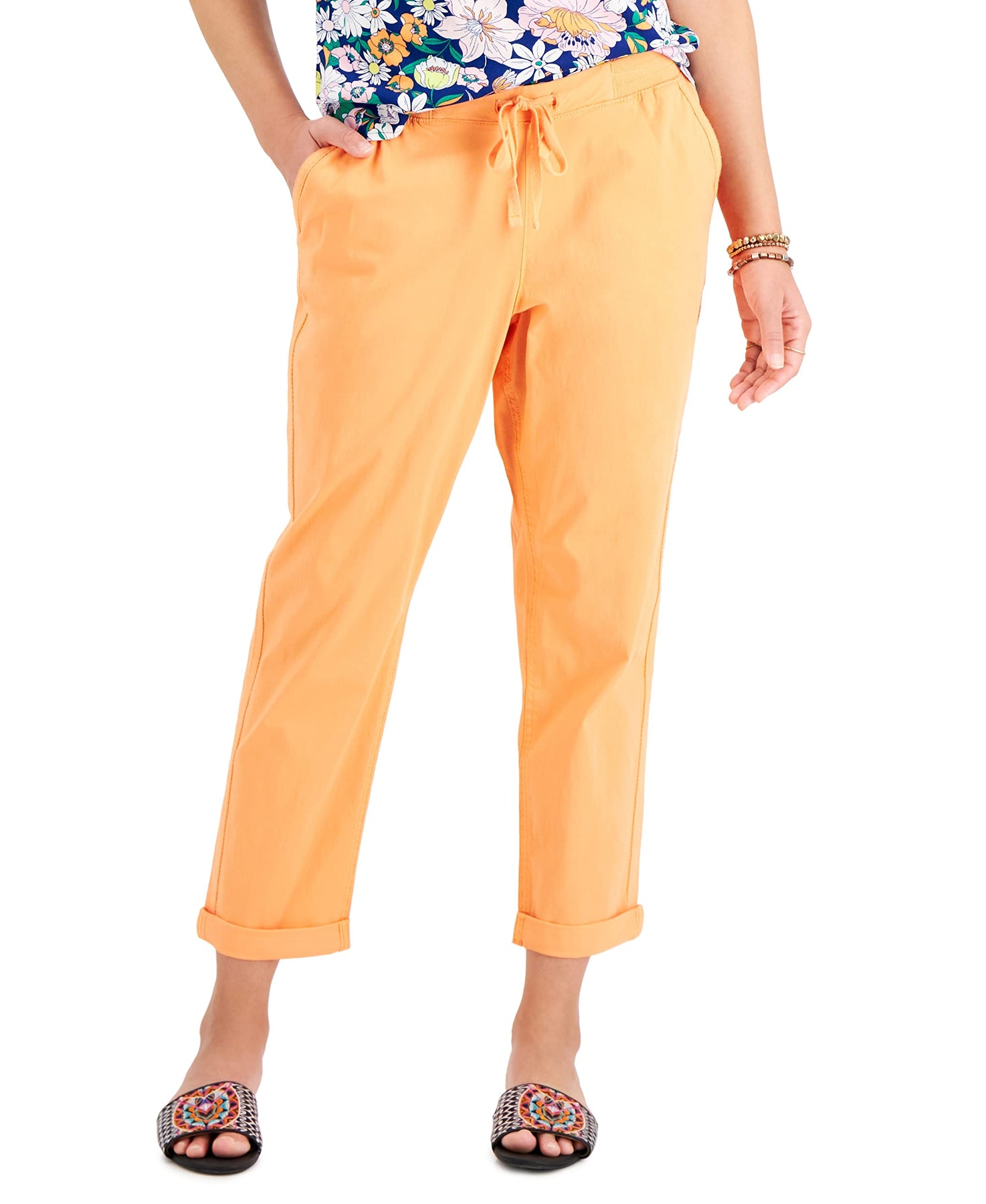 Stroll about the town with confidence in Style & Co's pull-on cuffed twill pants. Approx. model height is 5'10" and she is wearing a size 4 Approx. inseam: 25-1/2" Mid rise; relaxed fit; straight leg Pull-on style; adjustable drawstring at waist Cuffed at hem; twill trim On-seam pockets at front; welt pockets at back Cotton/spandex Machine washable Imported Web ID: 14533241