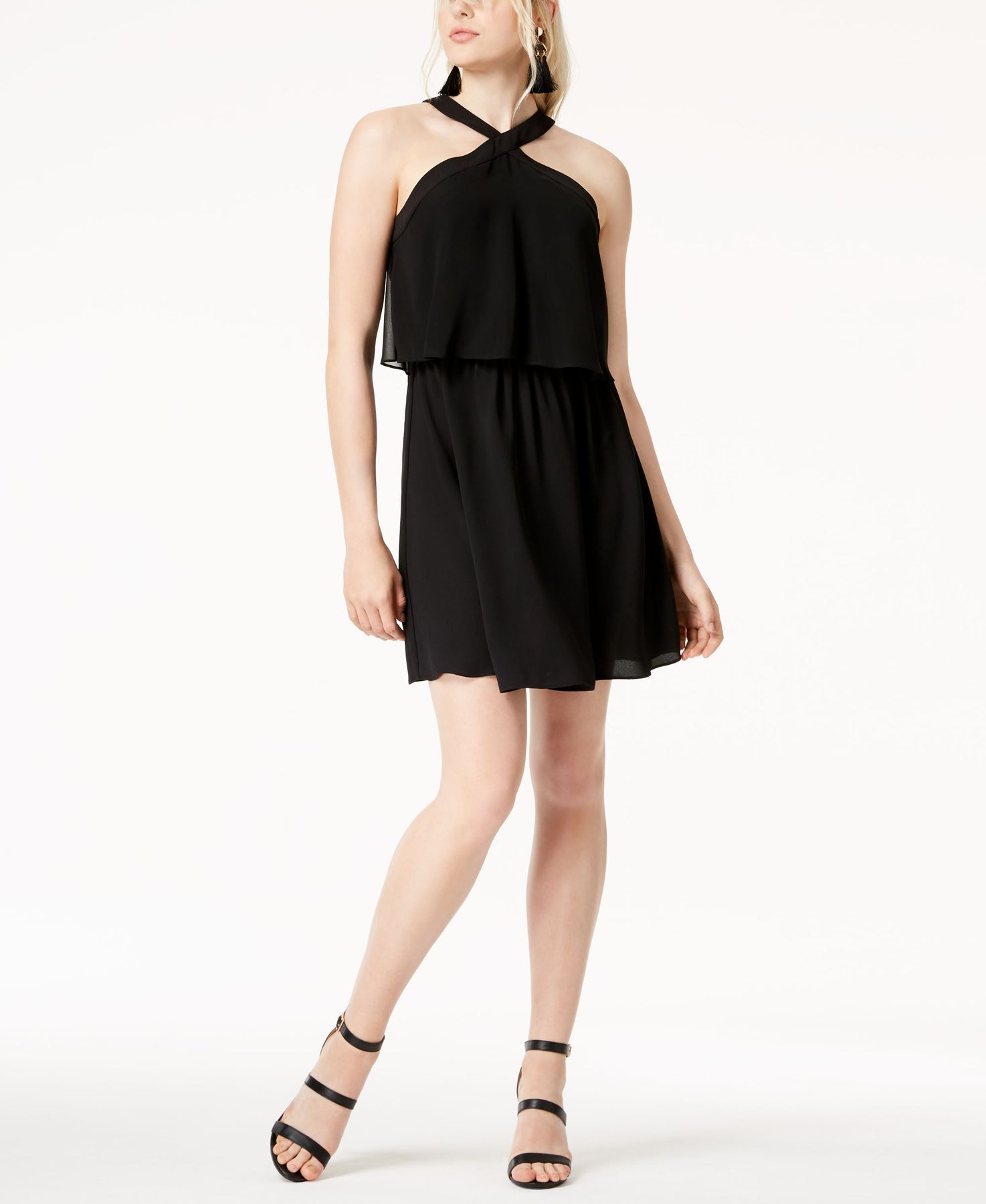 A chic popover detail at the bodice adds a pop of flirty fun and appeal to this Bar III dress with a halter neckline. Short length; shift silhouette Halter neckline; back zipper closure Flounce popover at upper body Polyester Machine washable Imported