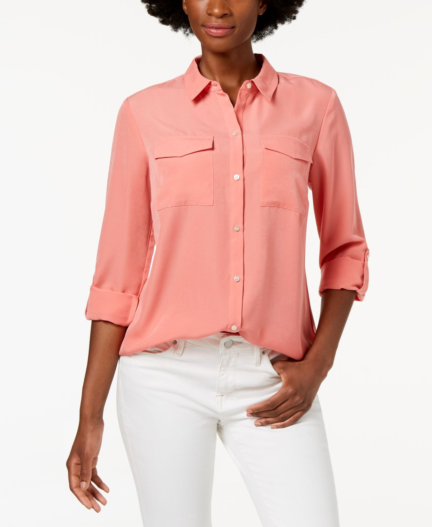 Charter Club's versatile tab sleeve blouse has long sleeves you can roll up at the office and look great in all day long. Approx. model height is 5'10" and she is wearing a size small Relaxed fit; hits at hip Due to generous sizing, we suggest sizing down for the perfect fit Point collar; button-front closure Flap chest pockets; pleated back yoke Long sleeves with adjustable button tabs Front and sleeves: polyester; back: polyester/spandex Machine washable Imported