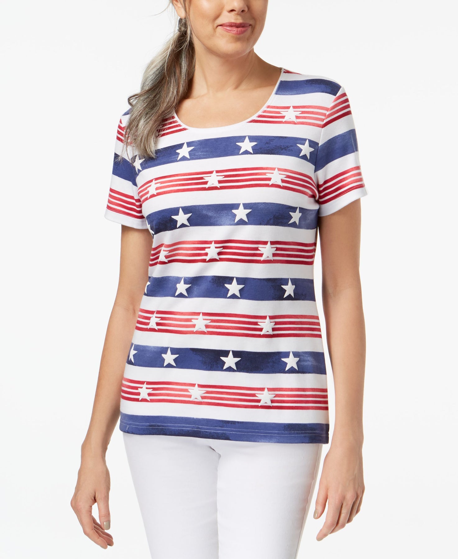 Your style star shines bright in this petite T-shirt by Karen Scott in breathable cotton that stands the test of time. Relaxed fit; hits at hip Designed to fit and flatter 5'4" and under frame Scoop neckline cotton/poly Machine washable Imported