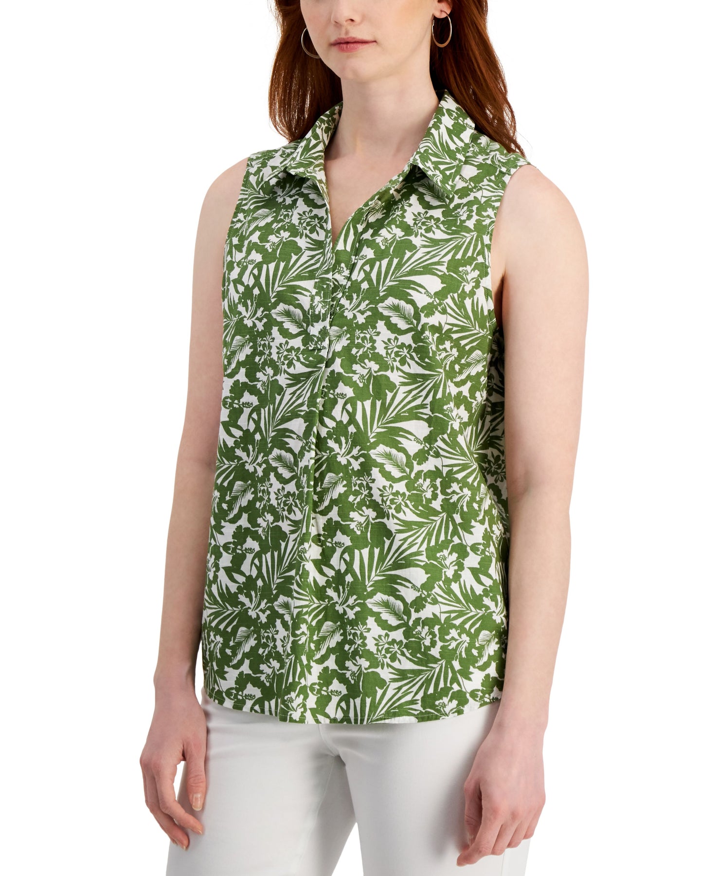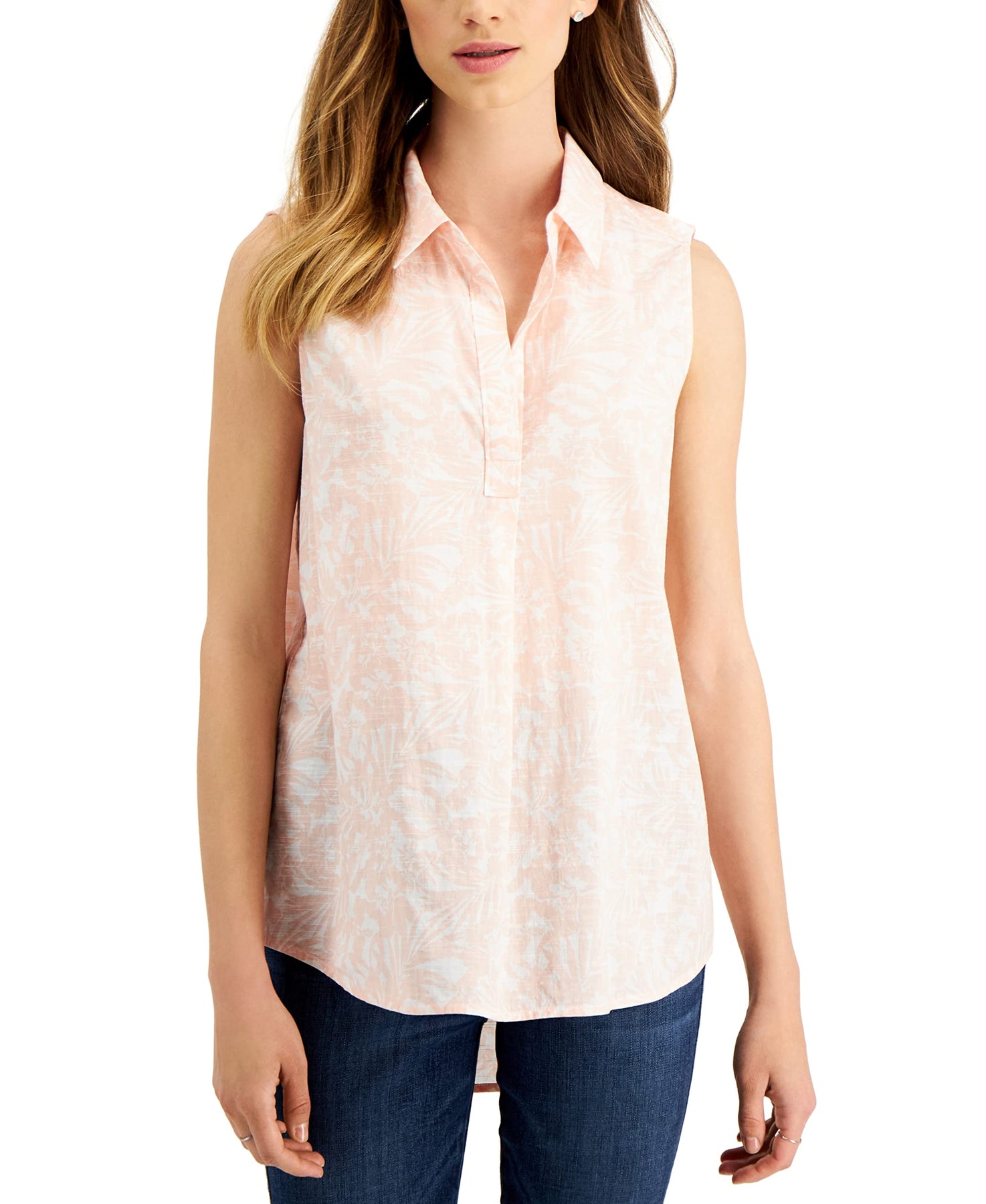 A polished take on a tropical vibe, this cotton poplin popover shirt from Style & Co features a sleek tonal print and cool sleeveless feel. Approx. model height is 5'10" and she is wearing a size small Spread collar with V-neck Pleats at back 100% cotton Machine washable Imported Web ID: 13712592